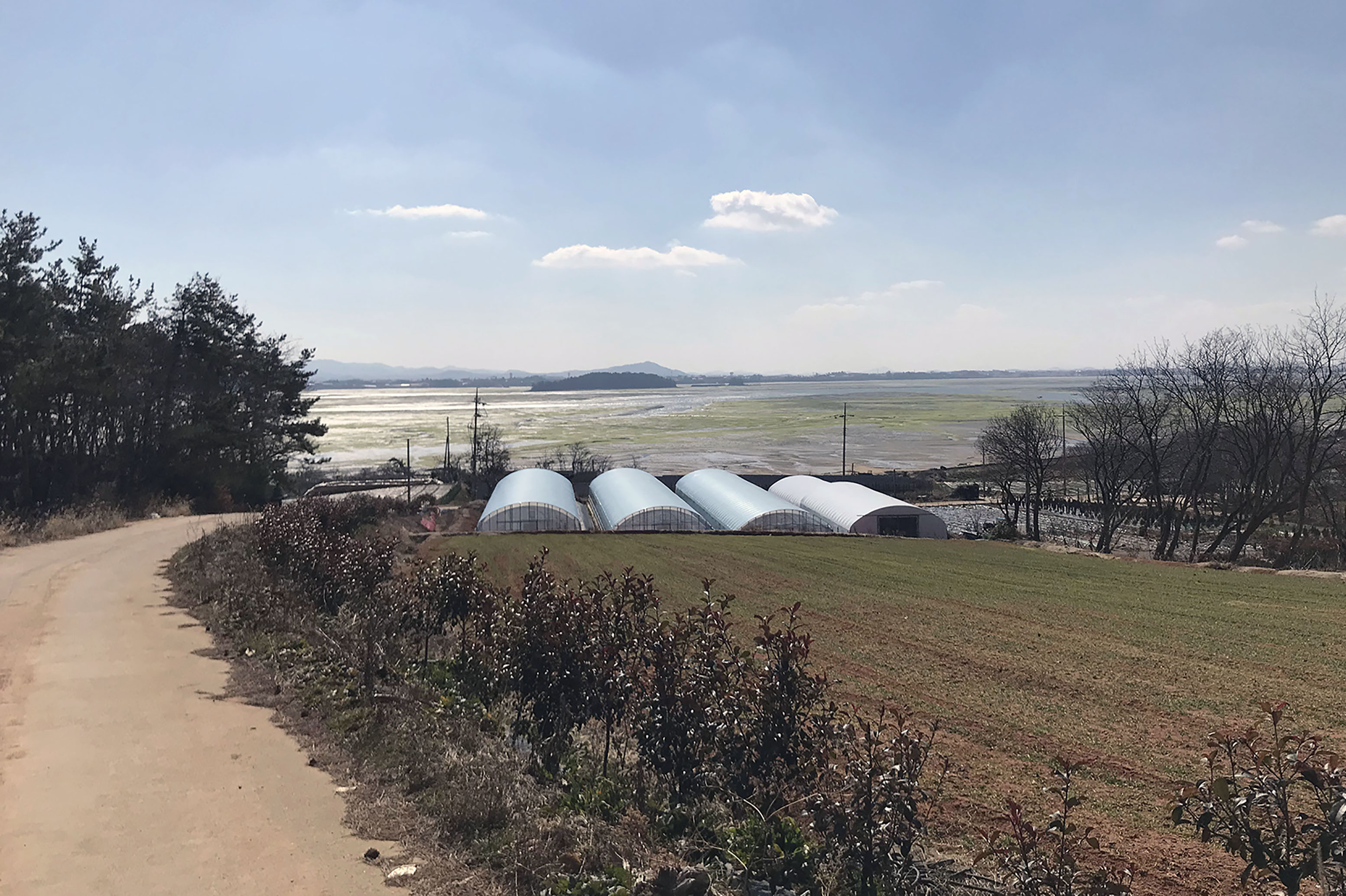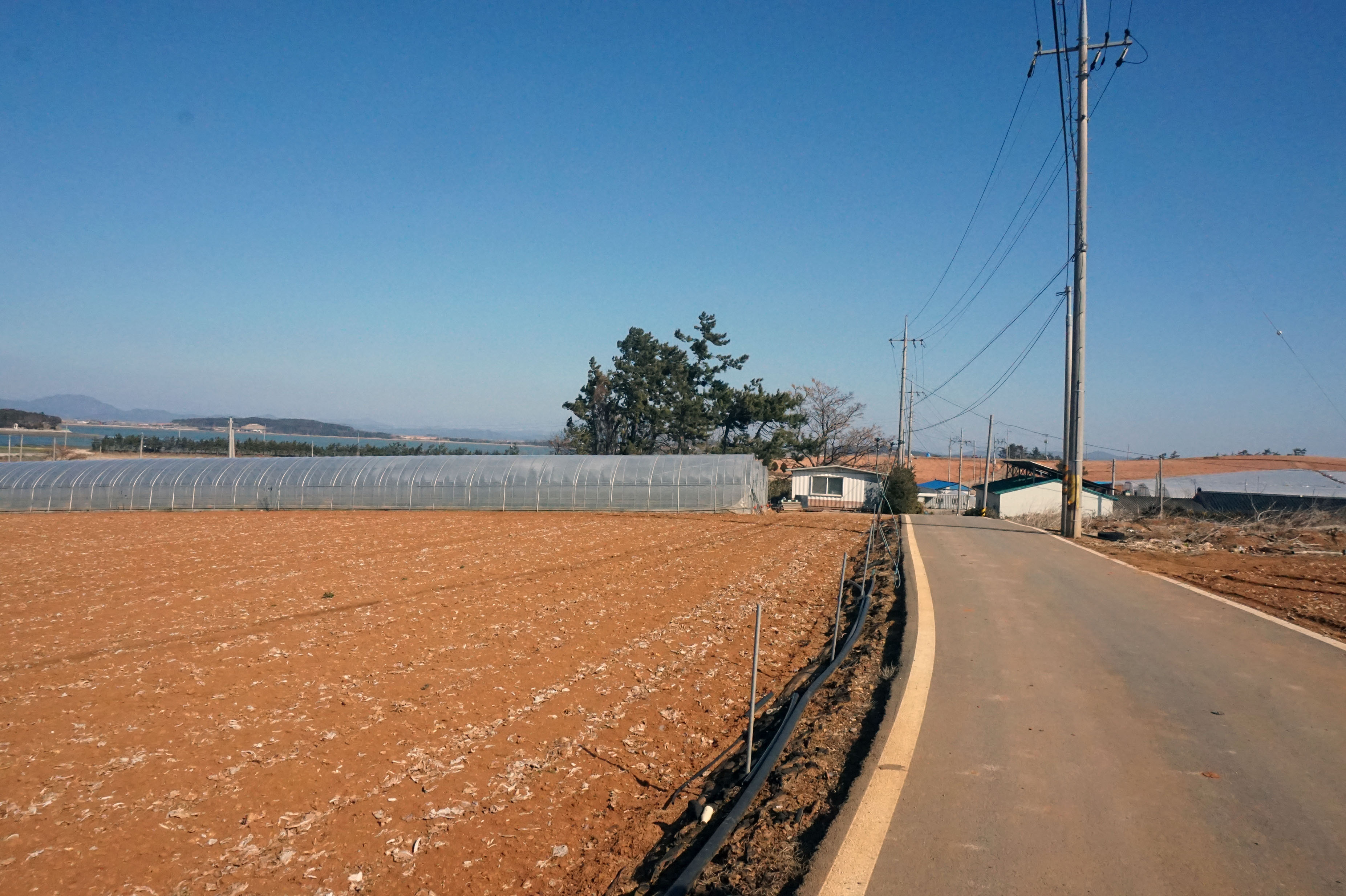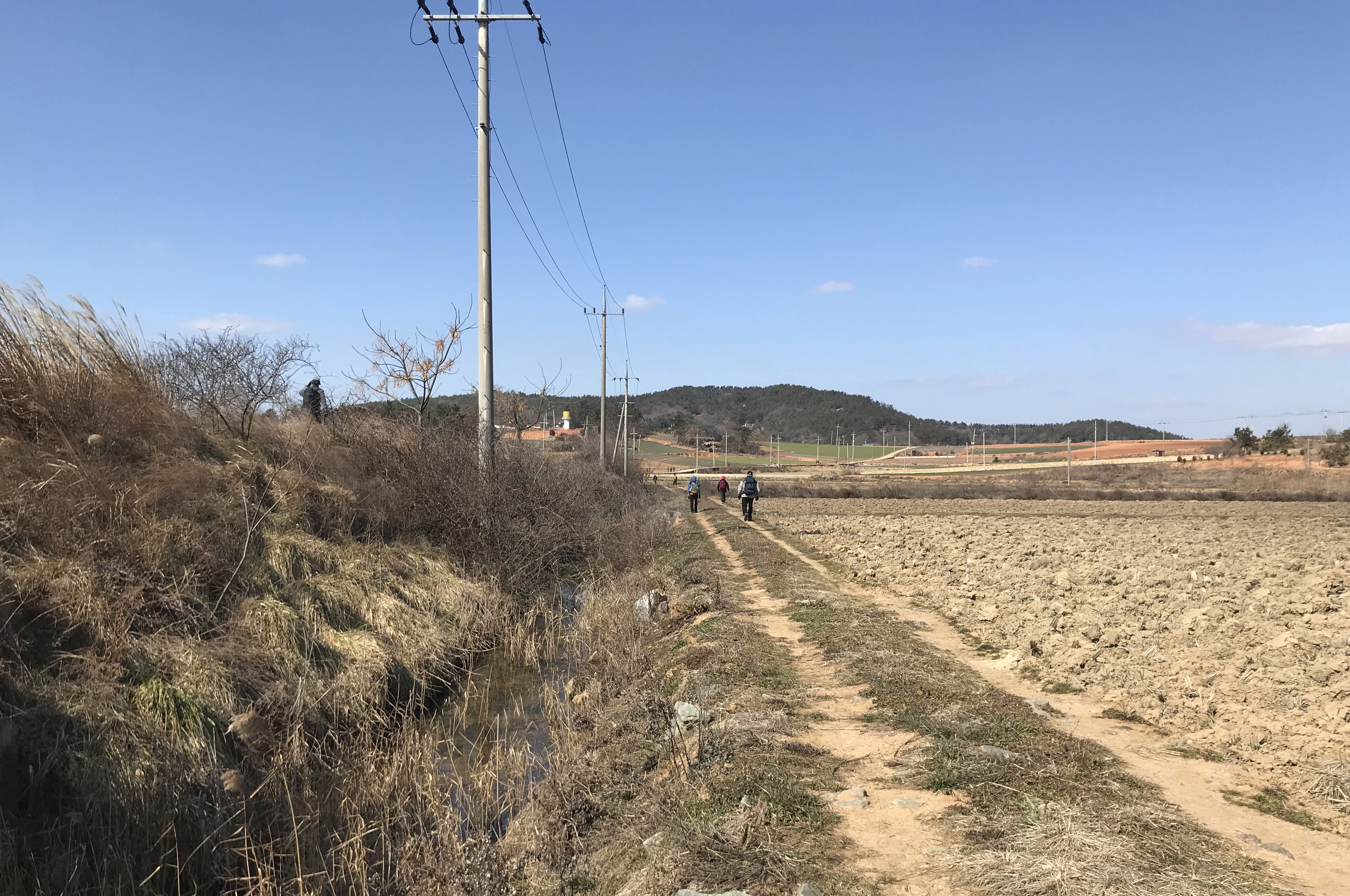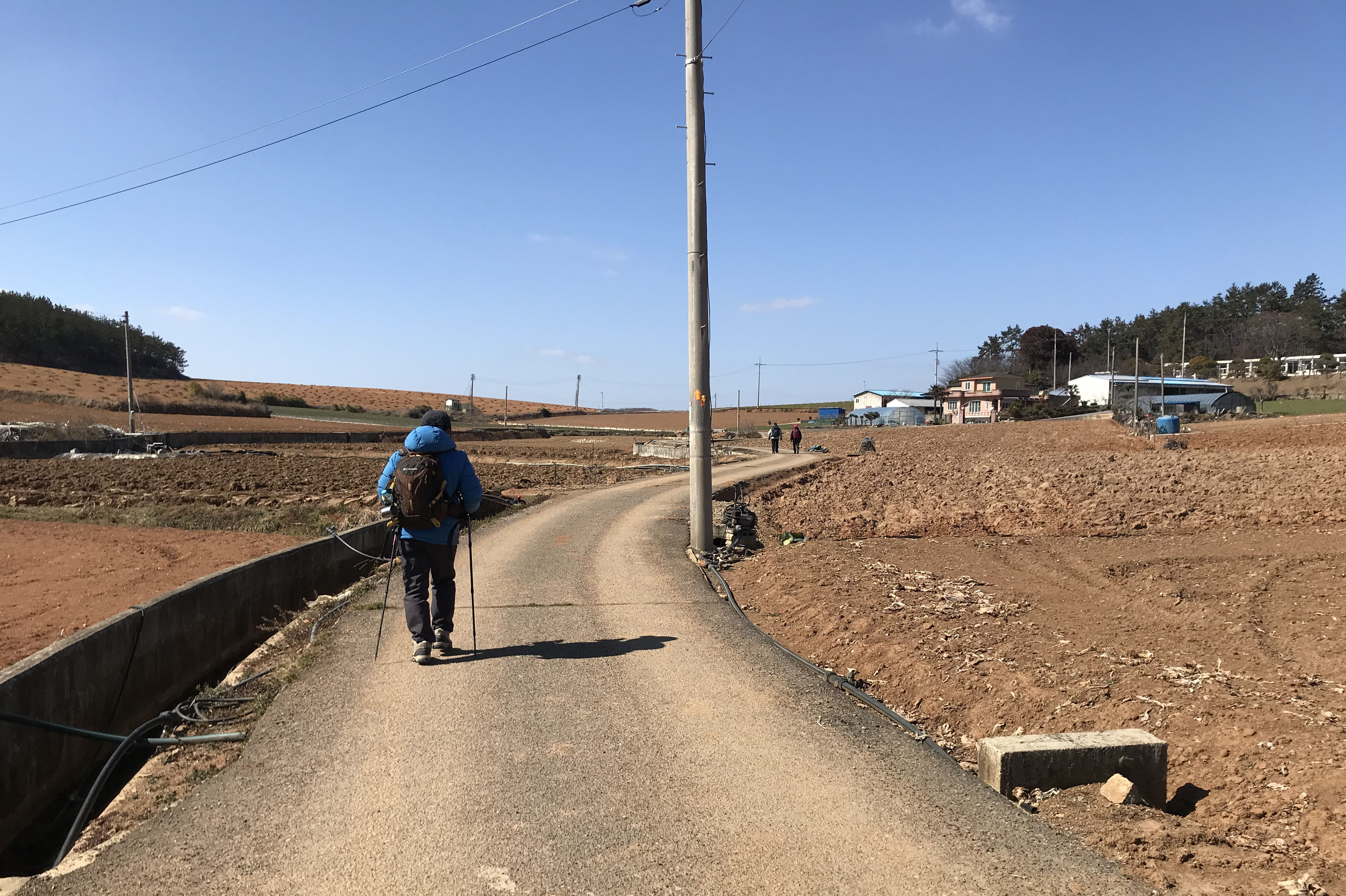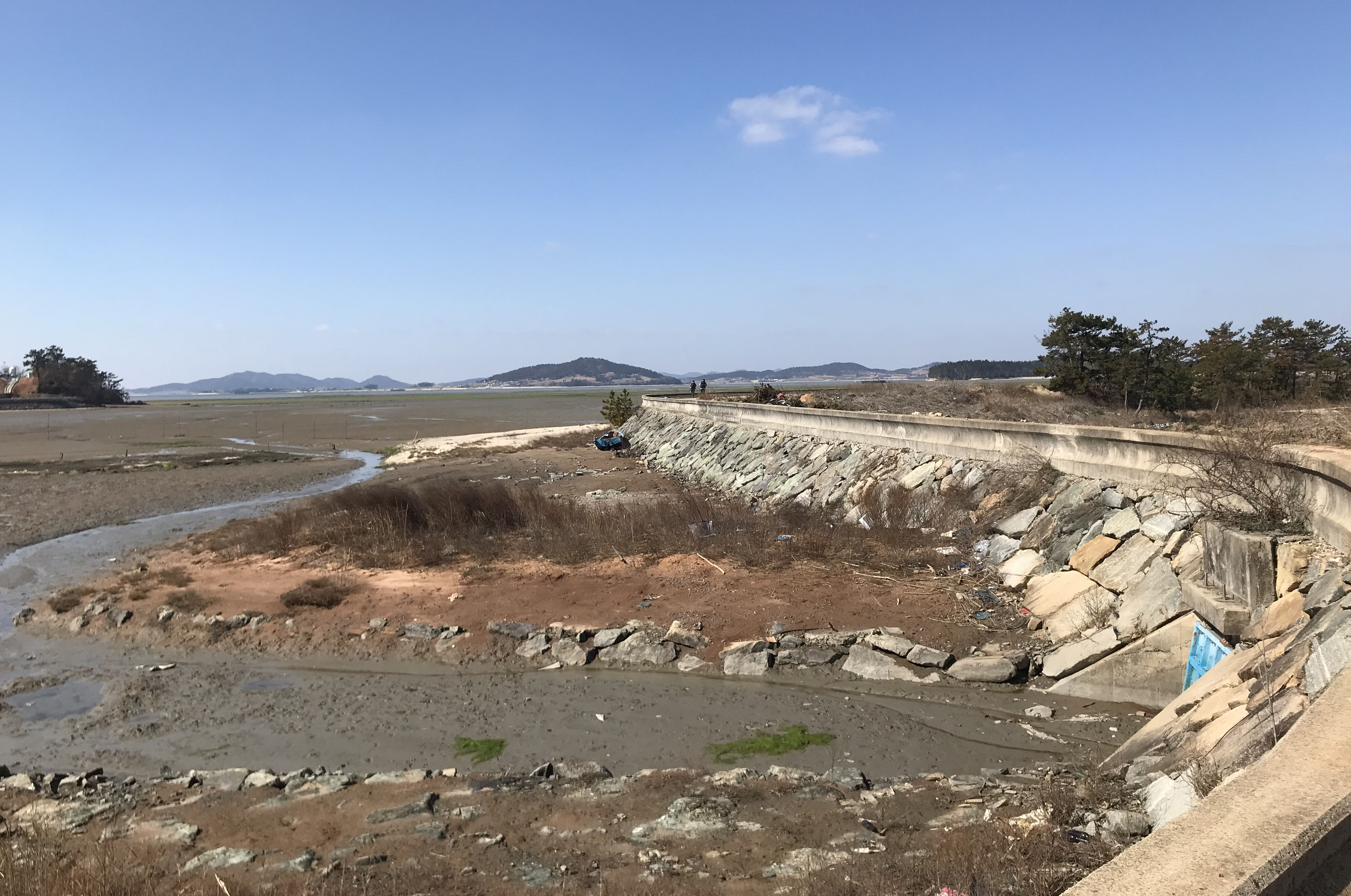 최근 미세먼지로 인해 걷기도 불편하고 풍경을 사진에 담아도 흐린 수묵화이었는데, 오늘은 푸른 하늘을 오랜만에 볼 수 있는 쾌청한 날씨지만 강한 맞바람이 걸음을 무겁게 한다. 마을길로 드넓은 갯벌에 초록색 해초만 보이는 함해만을 바라보며 내려간다. 오래된 것으로 보이는 짧은 방조제를 둑으로 가기도 하지만, 대부분은 바람을 다소나마 피하기라도 하듯 아랫길을 택하여 간다. 산다운 산이 없는 비산비야(非山非野)의 구릉지는 오늘도 이어져 오르락내리락 한다. 방조제 제방이 끝나면서 현경면 용정리에서 오류리(五柳里)로 바뀐다.