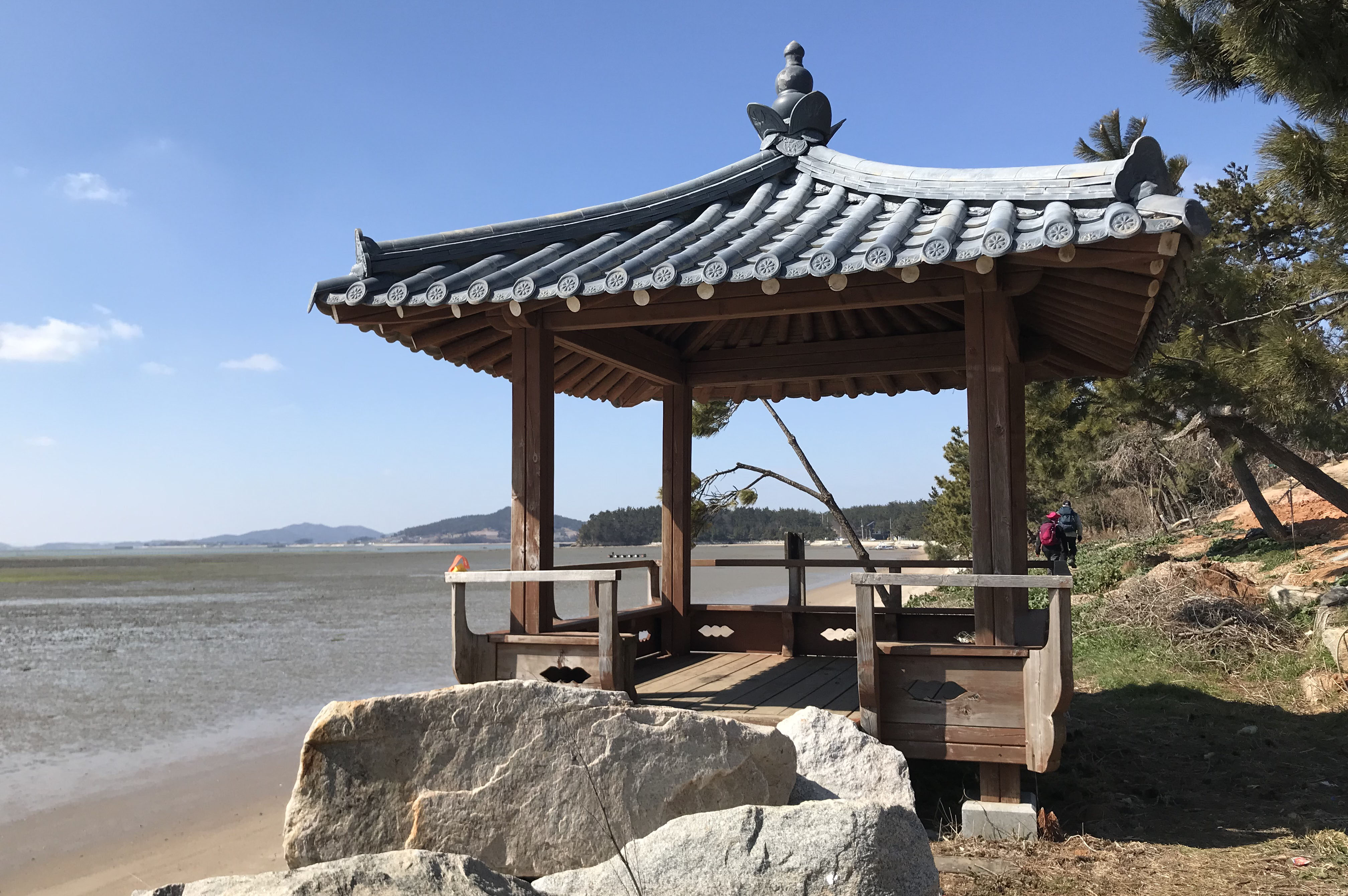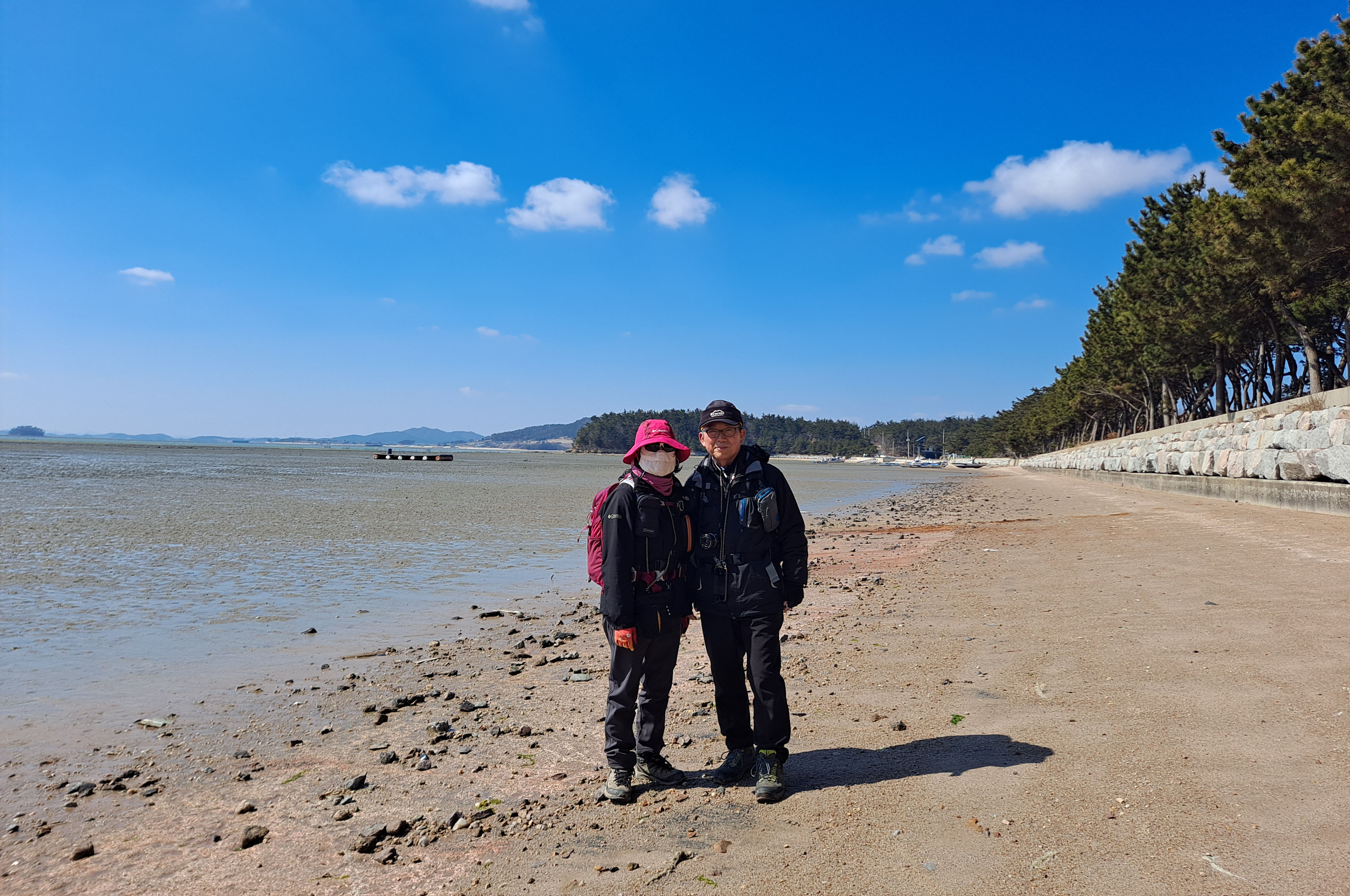 진성축산은 대규모 양돈 사업하는 회사로 정문에는 해태상과 방역을 위한 차량 소독 시설까지 갖추었다. 20km를 넘는 장거리 코스이다 보니, 일부 산우들이 짧은 B코스를 택해 가서 인지 후미를 벗어나기 어렵다. 오늘 처음으로 이 산방을 찾았다는 연세 드신 산우도 후미가 되어 함께 이야기를 나누며 간다. 썰물로 인해 바닥을 들어낸 갯벌을 바라보며 굴곡진 해변 따라 간다. 길게 뻗어 있는 해송 숲 사이로 걸으니, 강한 바람을 막아 주워 아늑하다. 곶으로 뻗어 나온 홀통해변을 향해, 해변 길과 우회 길 갈림길에 쉼터 정자가 쉬어가라 한다.