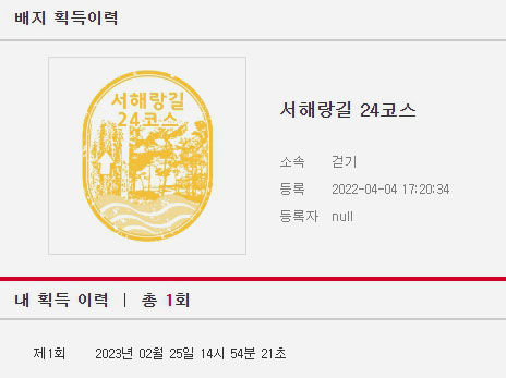 < 트랭글, 서해랑길 24코스 배지 획득이력 캡처 >