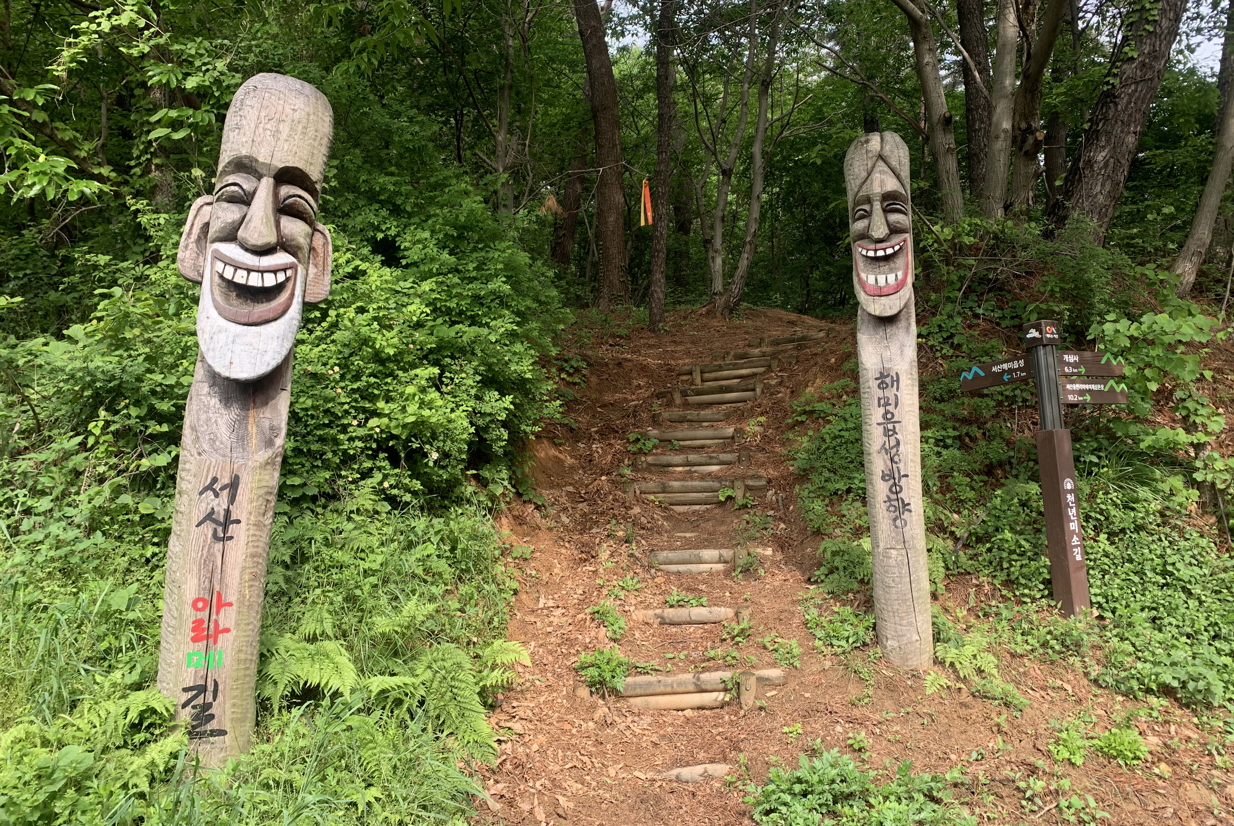 < 9:33, 아라메길 장승이 오학리 입구 표시 등산 하산로(←해미읍성 4.2km) >