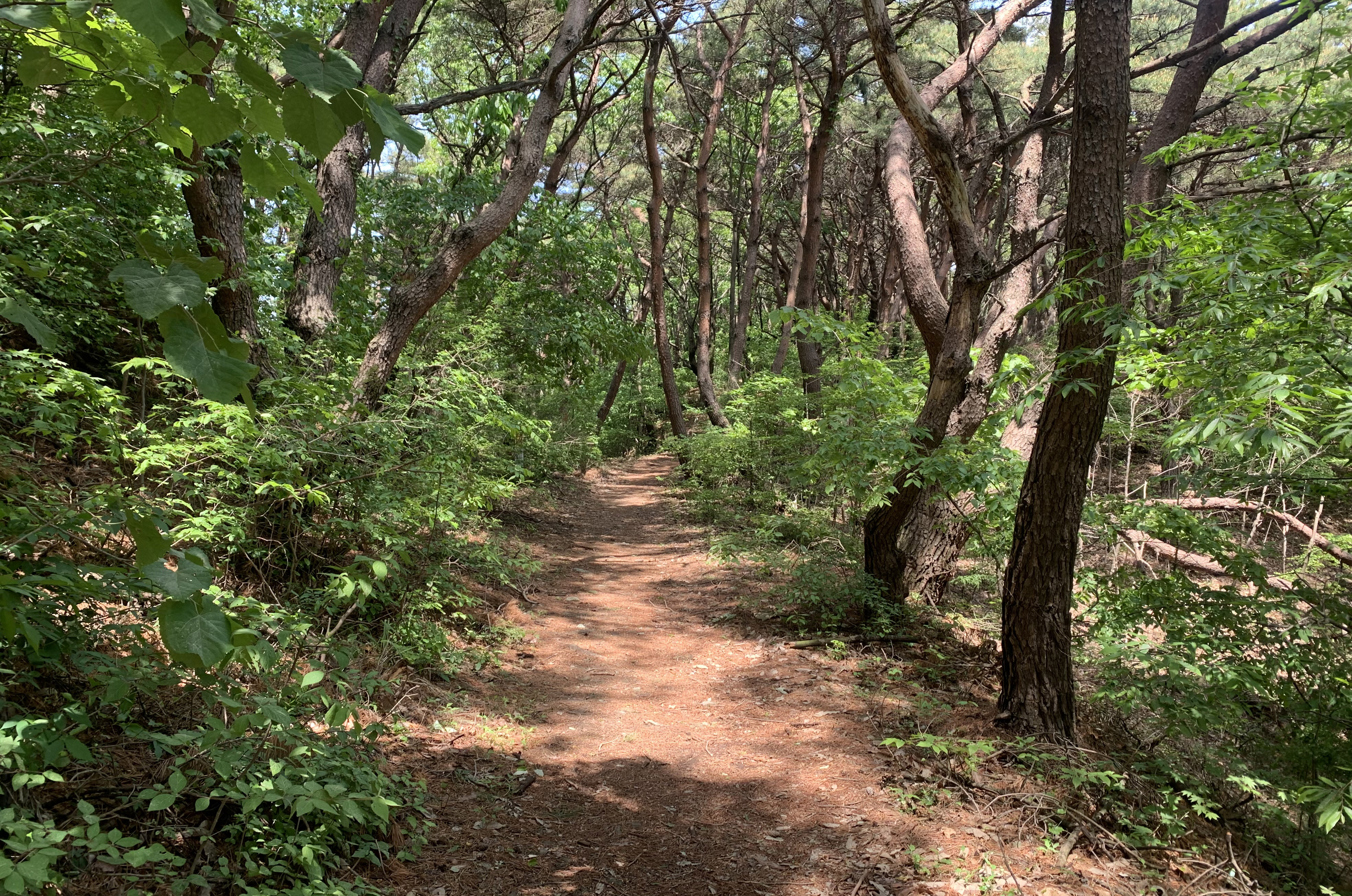 해미읍성을 좌측에 두고 고개를 오르니, 모퉁이 우측으로는 해자로 보이는 골이 깊은 곳도 보인다. 코너에서 우측 일락산(日樂山) 산자락으로 들어가면서 해미면 읍내리(邑內里)에서 오학리(烏鶴里)로 바뀐다. 정상을 우회하기에 등산로 따라 해발 100m 정도까지 오르는 듯하다. 울창한 숲 사이로 비추는 멋진 햇살과 함께 고요함을 깨우는 새소리만 들리니 상쾌하다. 파크골프를 친다고 배낭의 무게가 느껴져 벌써 어깨가 아프기 시작한다. 등산로 출구에는 서산 아라메길 안내 장승과 천년미소길 이정표도 있으며, 해미읍성에서 1.7km 왔다 한다.