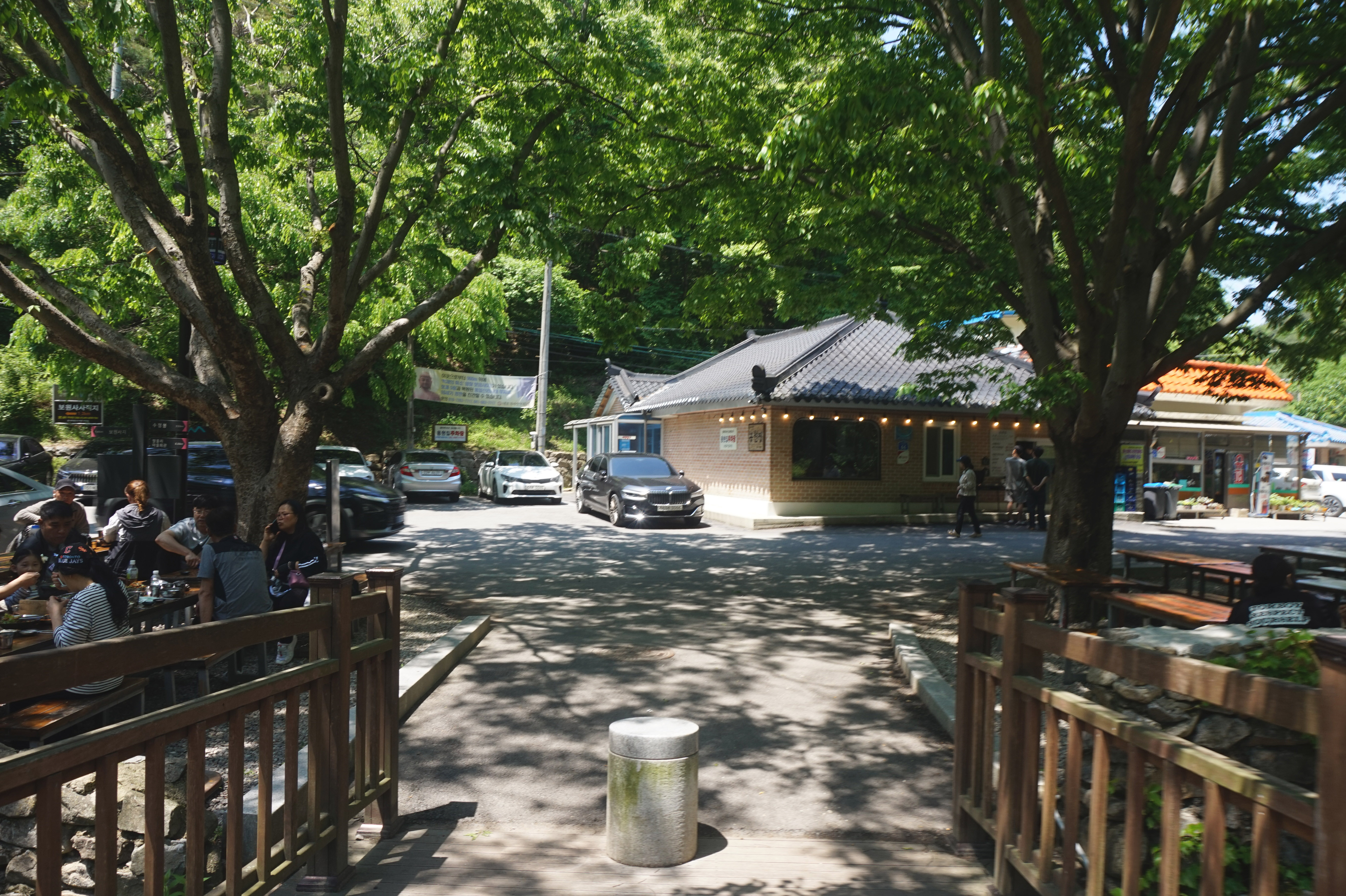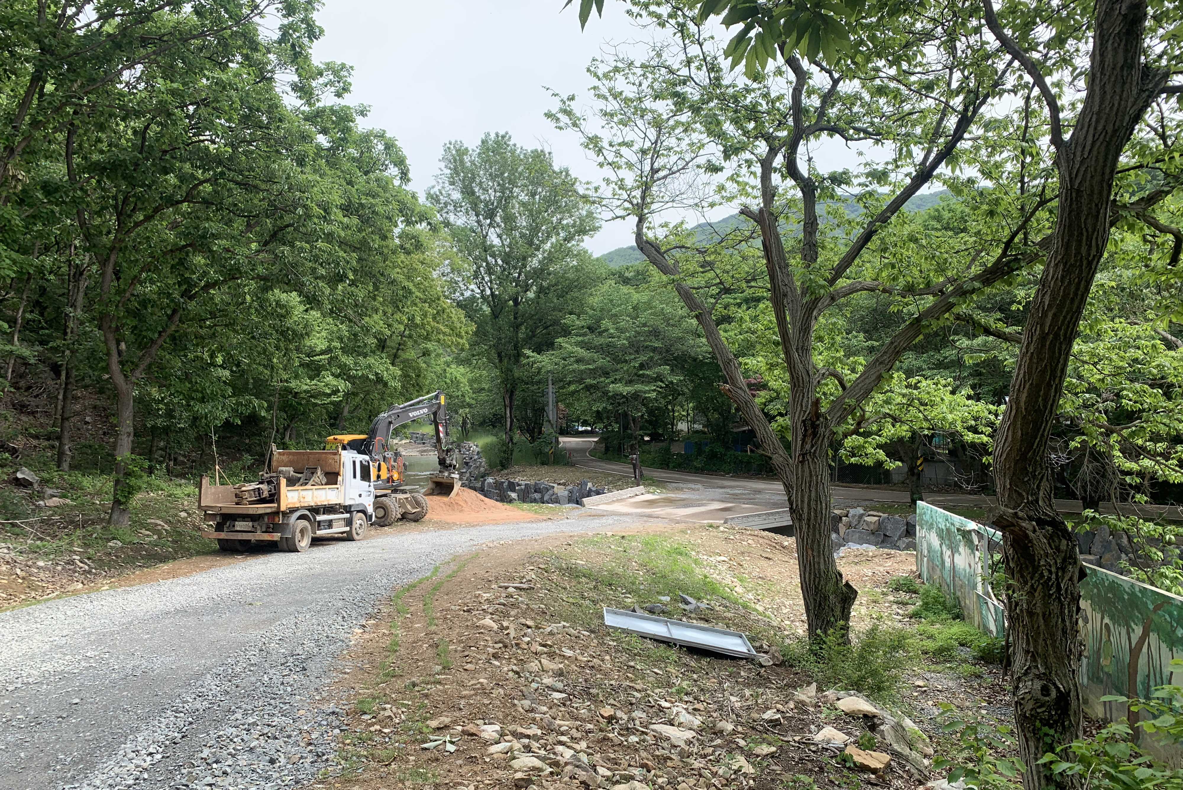 선 답사자가 코스 따라 갔다 길이 끊어져, 신설임도 낭떠러지로 위험하게 내려오거나, 뒤돌아 신설도로까지 회귀하는 고생한 후기를 읽었다. 앱은 수정되지 않아 경로를 이탈했다고 하지만, 공사가 끝난 넓은 임도 따라 내려온다. 한참 내려오니 낭떠러지 위에 코스 안내 리본이 달려 있는 것을 보니 아찔하다. 우측 우회 지름길로 기존 임도를 이용하더니, 다시 신설도로와 합쳐진다. 깊은 골 입구 하천 삼거리 전이 두루누비 중간 ②필수경유지이다. 하천 따라 내려가면 차량이 많은 삼거리를 만나고, 우측으로 가면 개심사 입구로 일주문이다.