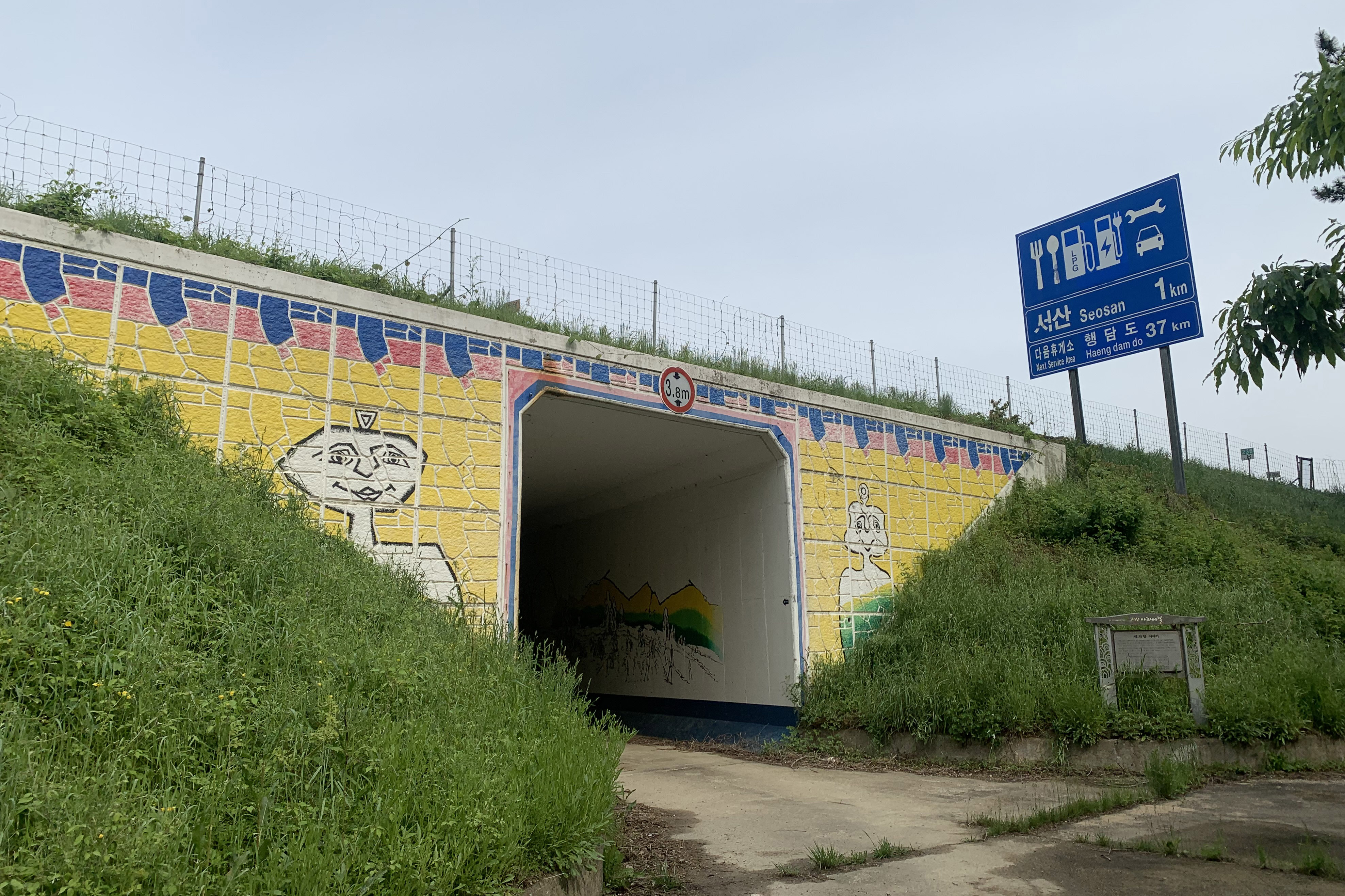 서산아라메길 장승 안내 표시로 내려와서는 평지가 이어지며, 가옥 한 채 앞의 넓은 밭(8:49)에는 감자가 자라고 있다. 서해안 고속도로 아래 굴다리를 통과 하니, 두루누비 중간 ①필수경유지라고 앱이 알려준다. 상행선 1km 지점에 서산휴게소가 있다는 고속도로 간판도 보인다. 이후부터 고도를 올리기 시작하여 해발 200m 이상까지 오르막 등산로이다. 배낭 위로 솟아 오른 파크골프채가 나뭇가지에 걸려 스치고 지나가니 신경이 쓰인다. 아라메길 종합안내도가 있는 쉼터에는 벤치들과 이정표(←해미읍성 3.8km, →개심사 4.2km)가 있다.