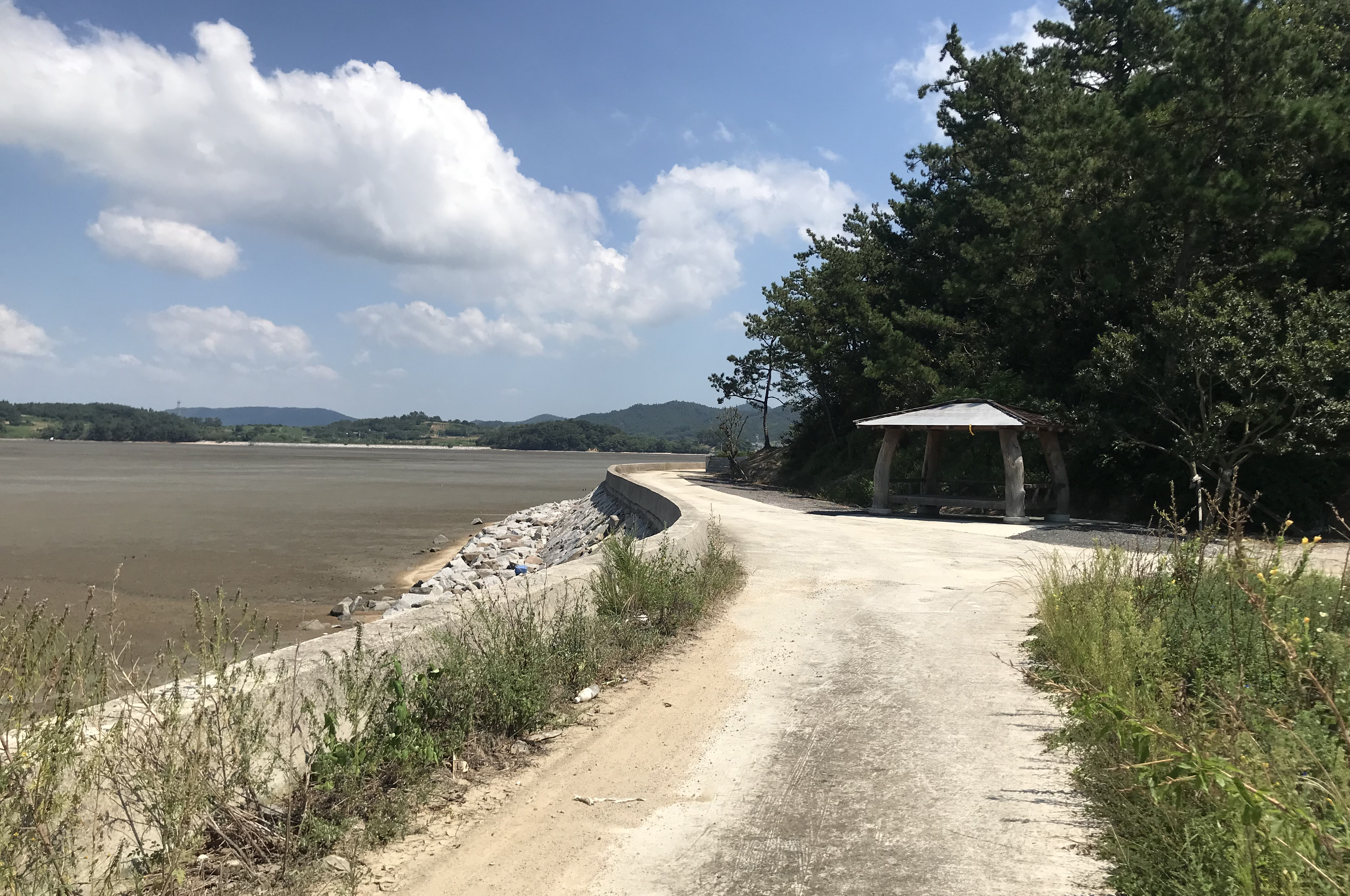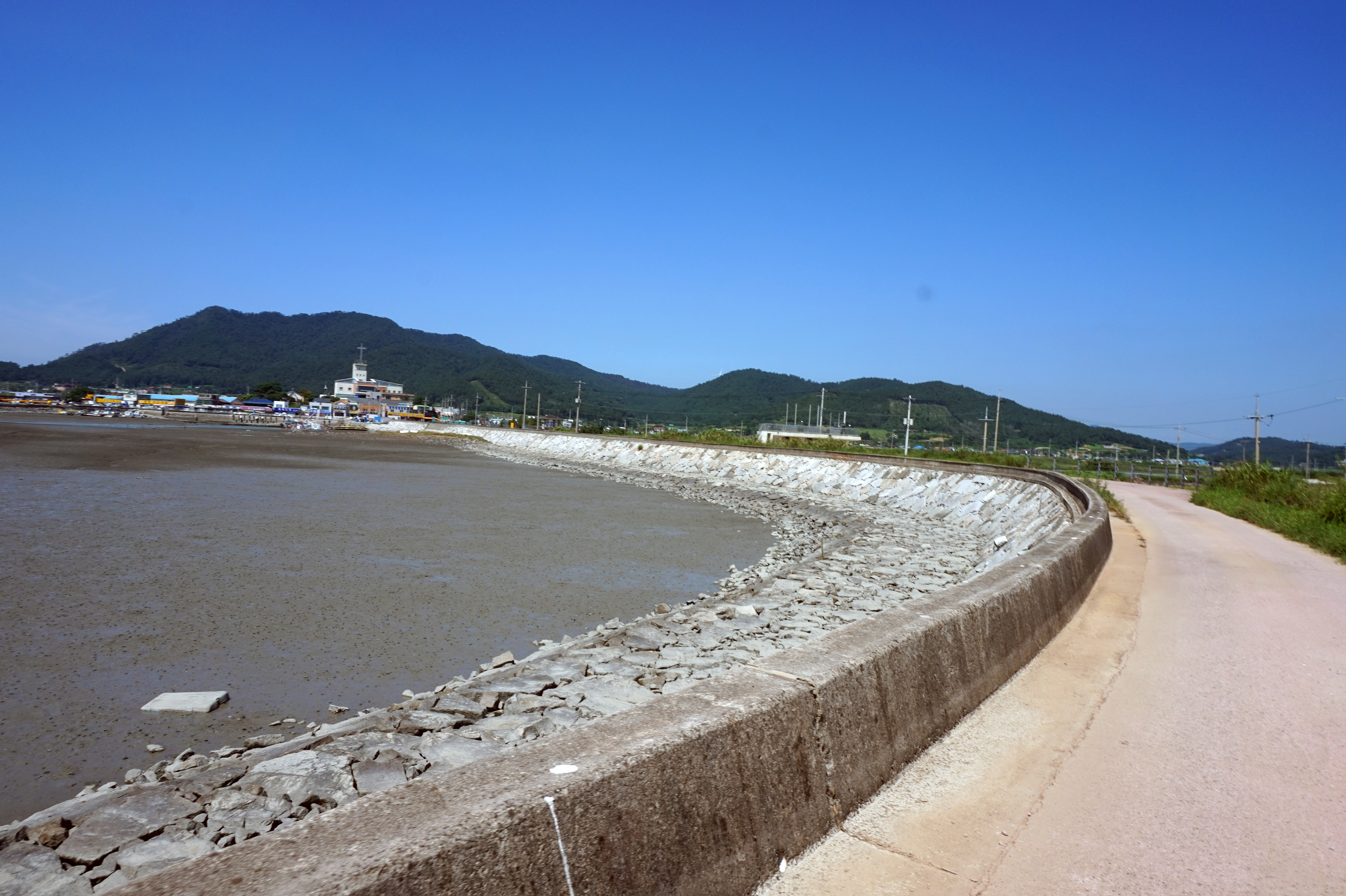 < 13:12, 2.1km 상당하는 긴 옥실(玉瑟)방조제를 걸어 >