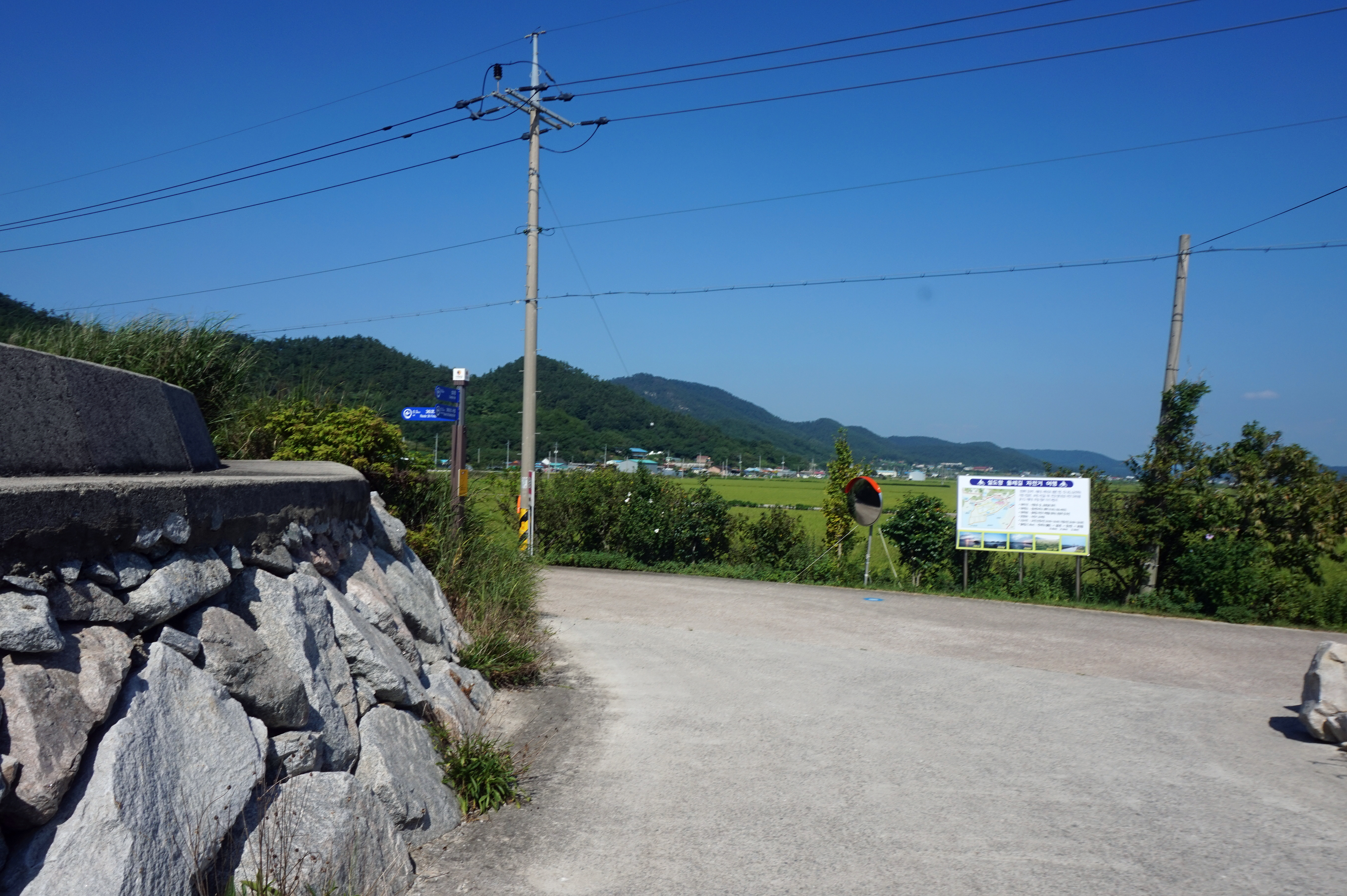 주어지는 시간이 항상 빠듯하다 보니, 생각은 있어도 그림의 떡이라고나 할까 마음의 여유가 없다. 먼저 도착한 많은 일행들이 기다리고 있기에 민폐를 끼치지나 않을까 걱정도 앞서기 때문이다. 설도젓갈 타운을 뒤로하고, 설도 방조제를 따라 가는데, 좌측 바다 건너편으로 출발하였던 칠산 타워와 칠산 대교가 보인다. 주요 거점 경로로 표시되어 있는 합산제(蛤山堤)를 찾아도 잘 보이지 않는다. 물을 뺀 것으로 보이는 넓은 저수지 모양뿐이 없는데, 이를 가리키는 것으로 추정한다. 돌출된 좌측해안으로 가는 코스와 직선의 갈림길이다.