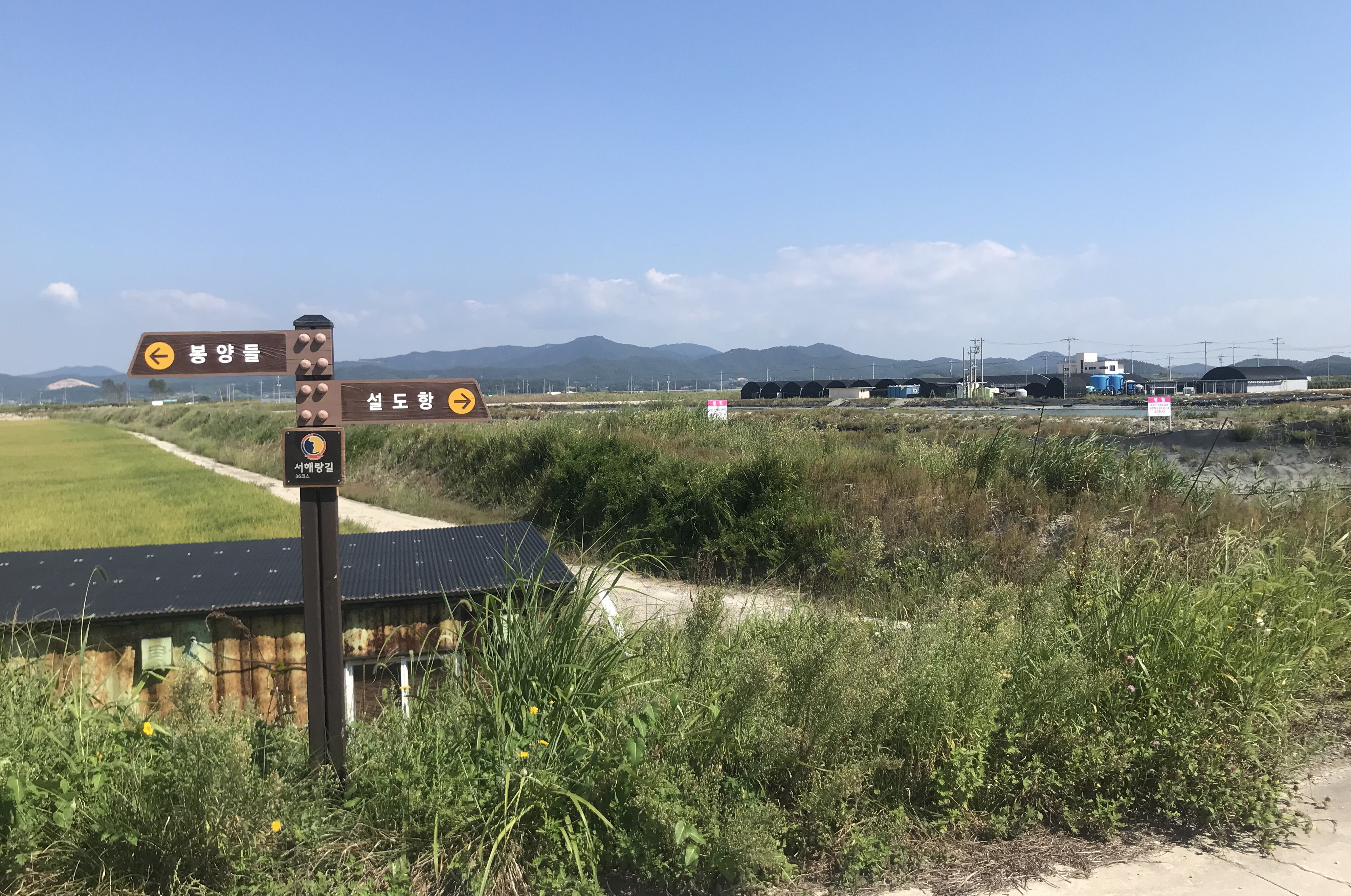 계속되는 염산방조제 길을 걸으면, 봉양들은 더 넓게 펼쳐지지만 서해랑길 종점이 300m 남았다고 좌측으로 이동 유도한다. 어느 해 보다도 최고의 폭염, 긴 장마 비, 불청객 태풍 등이 긴 여름 기간 동안 트레킹을 어렵게 하였다. 절기는 거스를 수는 없는 듯 백로가 지나니 서늘해져 한결 걷기가 수월해졌다. 약간의 마을 언덕길이 있기는 하였지만, 대체로 평탄한 갯벌의 제방길이 전부라고 해도 과언은 아니다. 염산면 봉남리 합산버스정류장에 위치한 36코스 종점이자, 37코스의 시점인 안내판 앞에서 마지막 인증 샷을 찍고 완주를 종료한다.