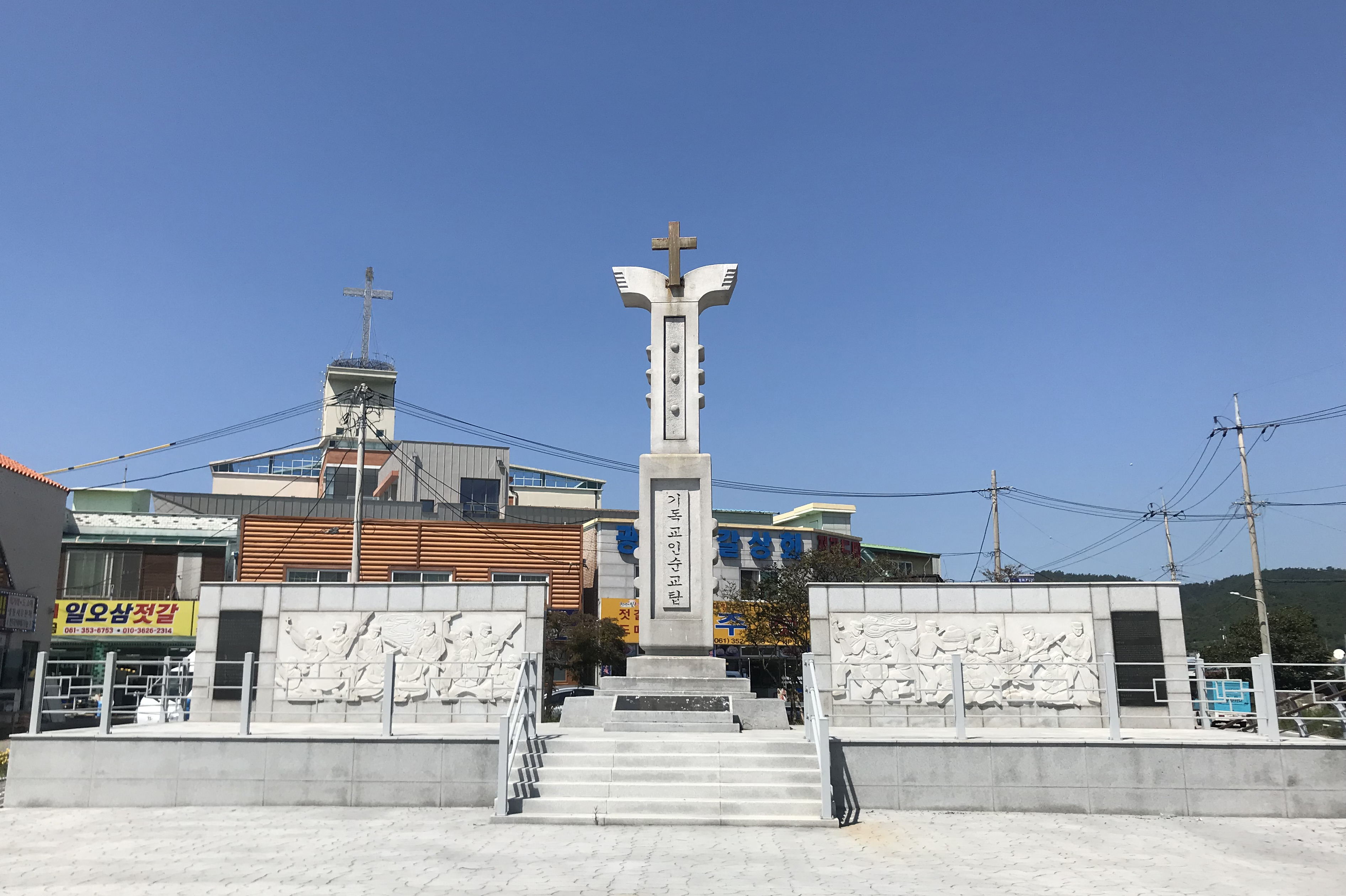 기독교인 순교탑 안내 설명문에 의하면, 1950년 6.25 한국전쟁 당시 신앙을 지키기 위해 자신의 목숨을 바꾼 순교자는 염산교회 77명의 성도들을 비롯해 영광군에 194명의 순교자들이 있는데 이들의 숭고한 신앙 정신을 기리기 위하여 역사적 사건의 현장인 이곳에 순교 탑을 세웠다. 순교성지를 지나면 모든 거리의 상점들과 시장의 건물 안에서는 각종의 젓갈들을 판매하는 것으로 보인다. 코스가 지나는 길가에는 시장에서 흔히 볼 수 있는 생선 판매 노점상들이 즐비하다. 손님들은 생선을 골라 회를 떠, 바닷가 파라솔 아래에서 맛있게 먹는다.