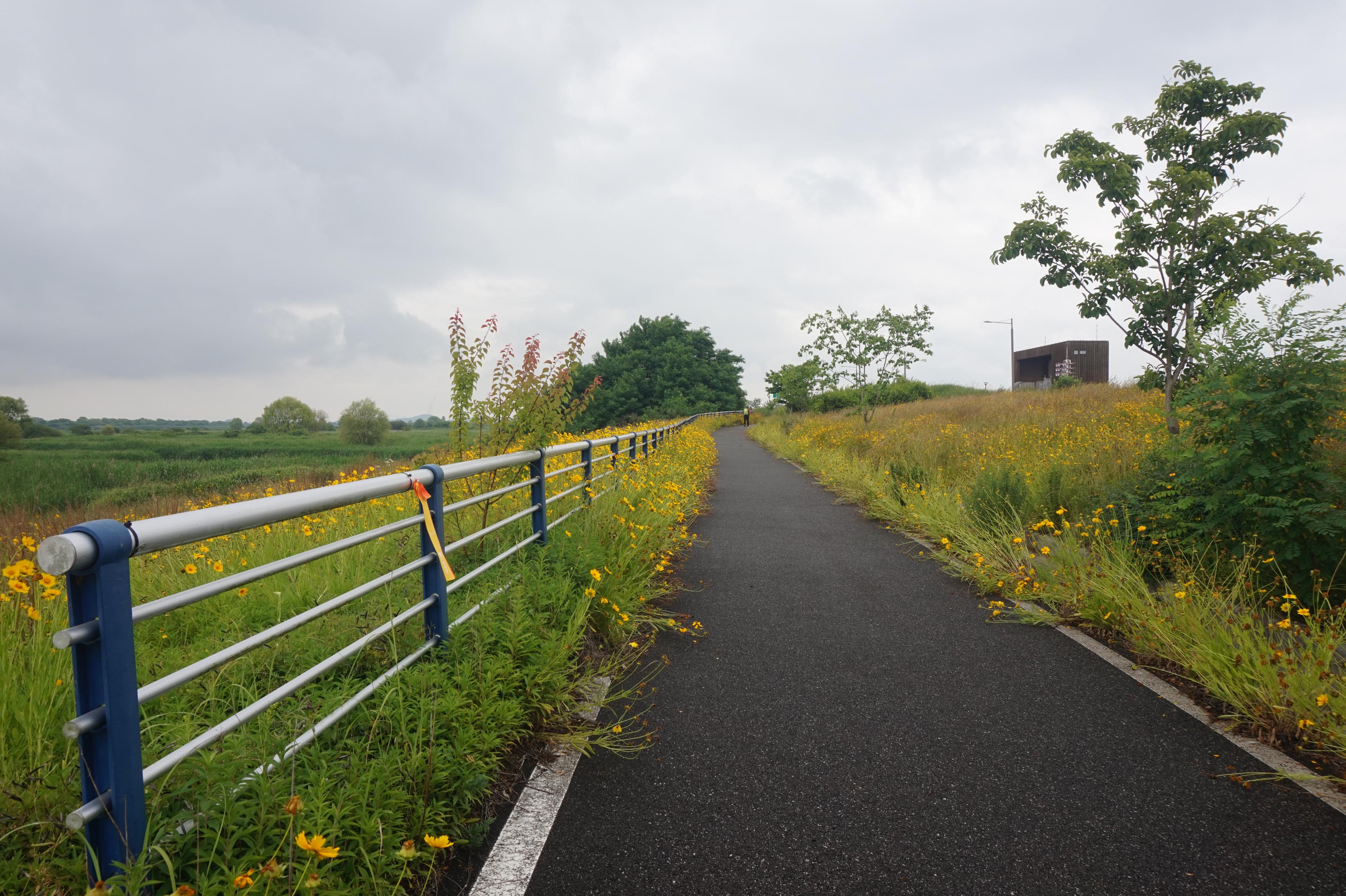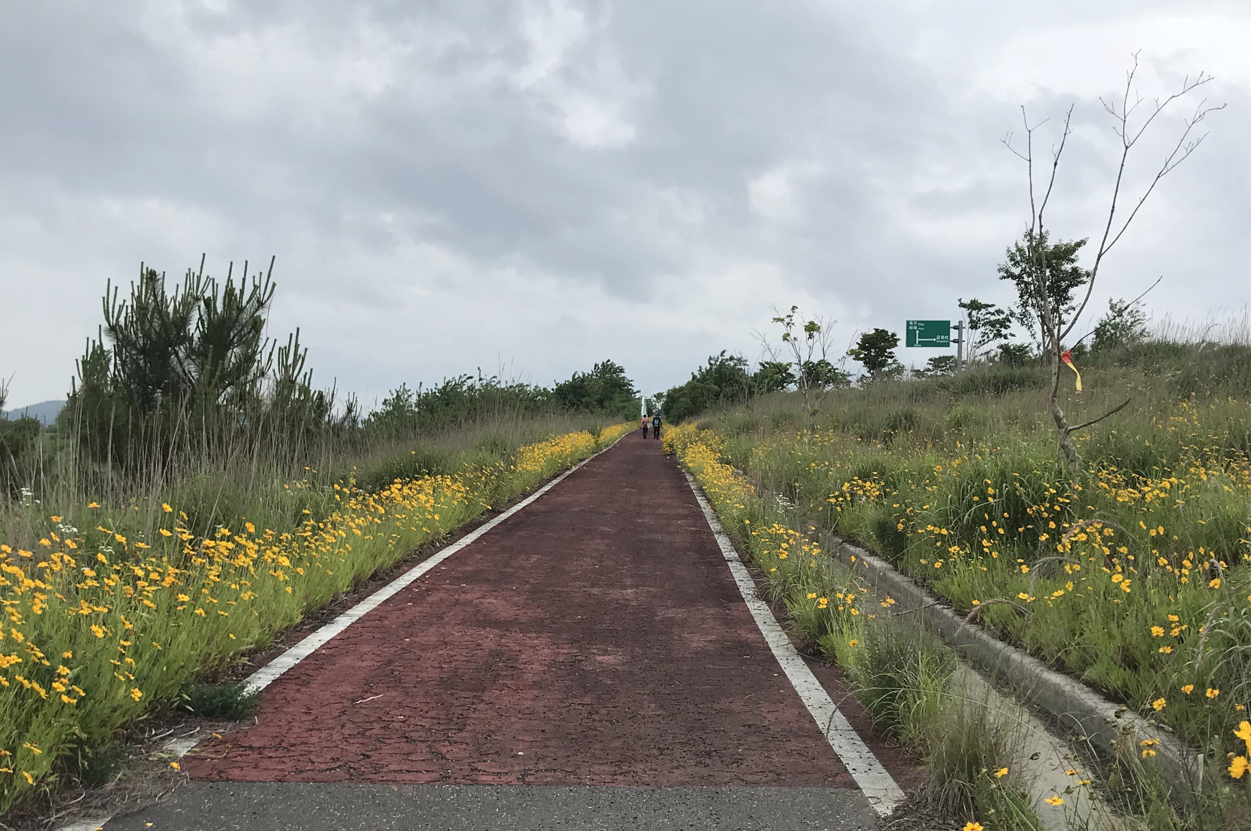 만경강을 바라보며 제방위로 걷다보니, 코스는 금계국이 활짝 핀 꽃길인 둔치 산책로로 내려가라 한다. 요즘 산책로 길가에는 노란 코스모스와 비슷한 금계국 꽃이 대세를 이룬다. 금계국은 잎이 비교적 타원형인데 코스모스는 잎 끝이 뾰족하다. 꽃말이「상쾌한 기분」이어서 일까! 꽃길을 걸으니 기분이 상쾌해진다. 강한 생명력으로 옆자리의 식물들까지 피해를 입혀 생태계를 망가트리기도 한다. 두루누비 중간 ①필수경유지는 갈대와 잡목이 우거져 시야를 가린다. 대야면 복교리에서 지경리(地境里)로 마을 이름이 바뀐다.