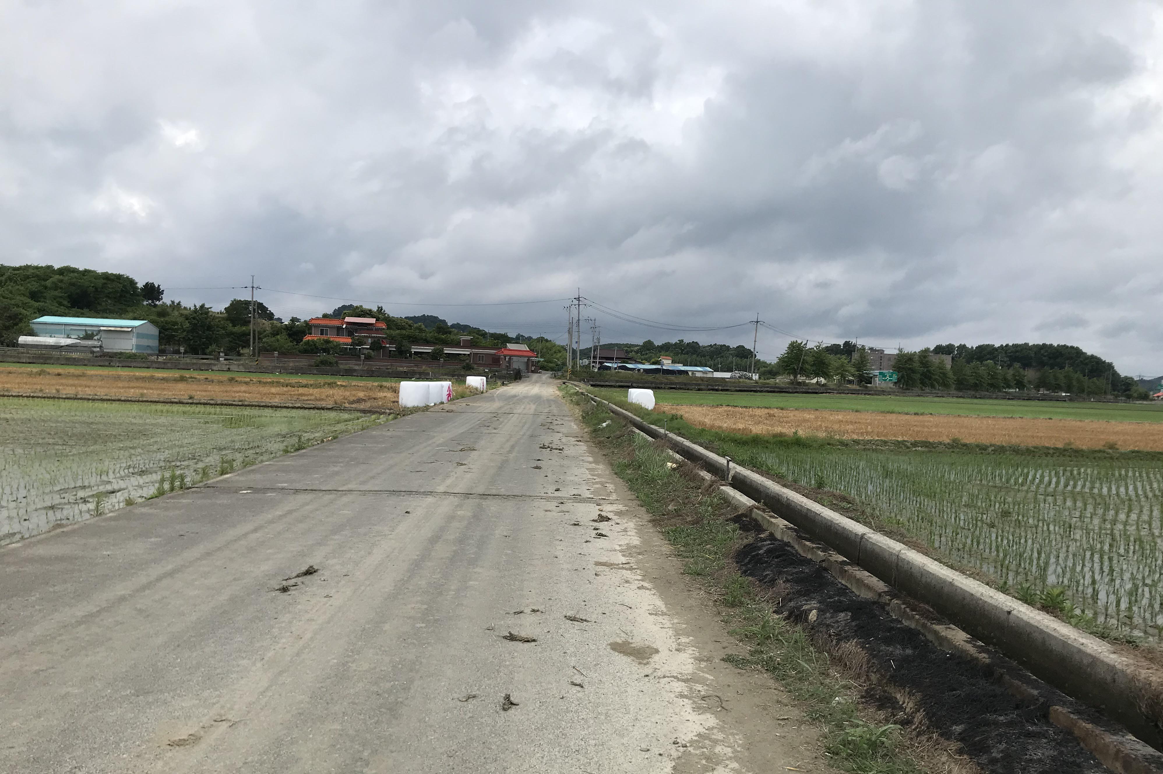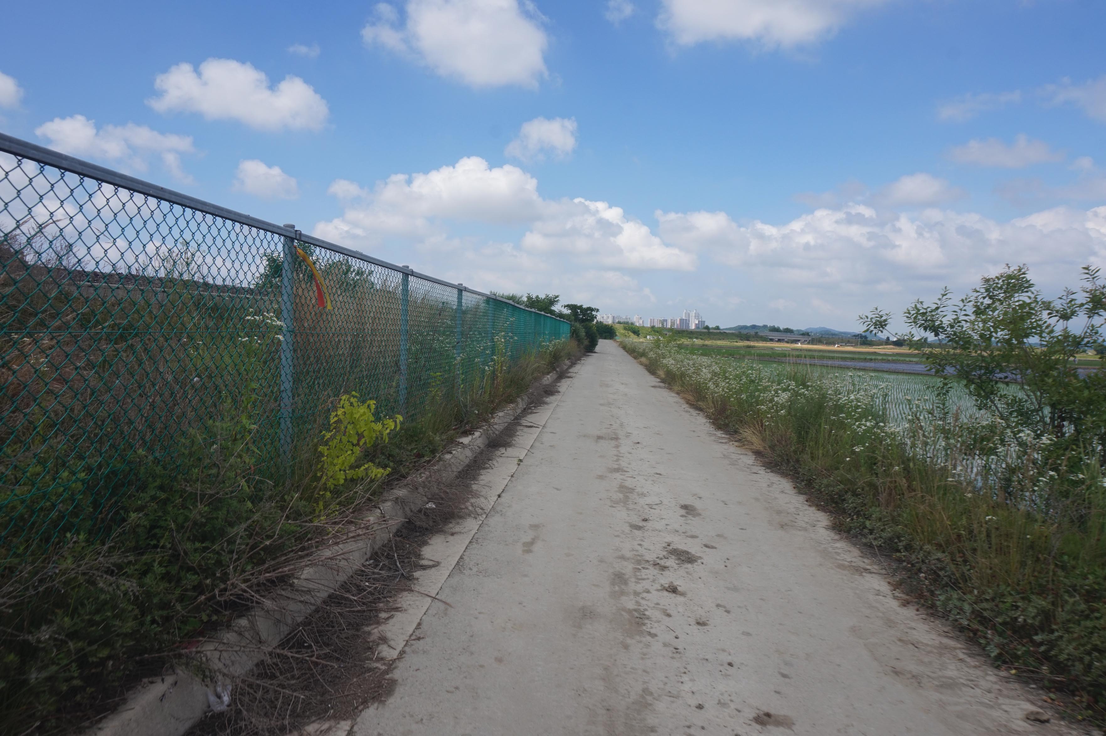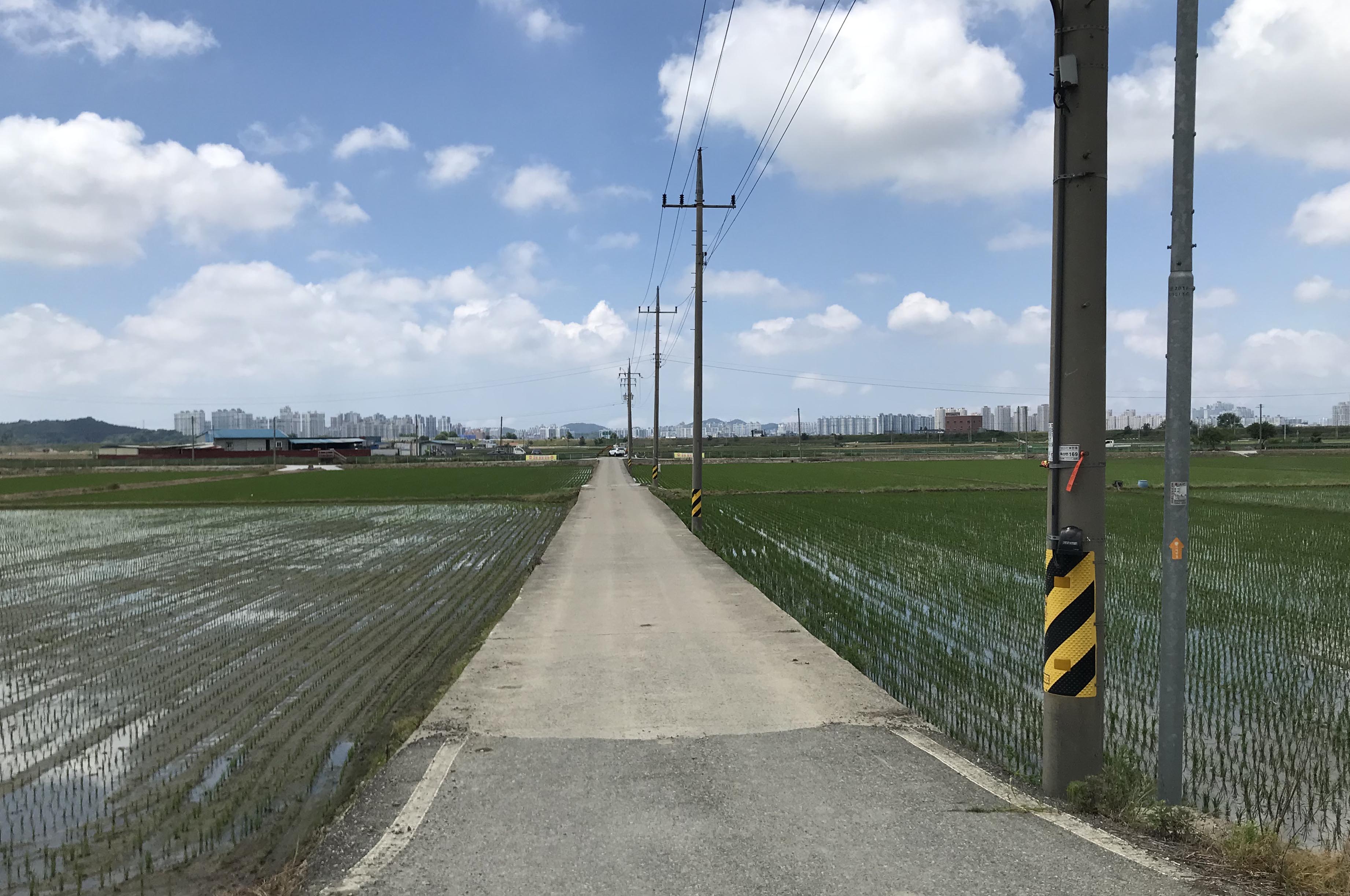 주어진 트레킹 마감시간이 짧은데다, 언제 쏟아질지 모르는 비구름으로 인해 발걸음을 재촉하곤 하였는데, 어느새 파란 하늘에 흰 뭉게구름이 두둥실 떠 있다. 더워진 여름 날씨에 비는 내리지 않아, 더위를 모르고 트레킹 시간을 단축하는 일석이조의 효과를 보았다. 하염없이 석교 들판 농로 따라 방향을 바꿔가며 걷다보니, 앞에 군산시내가 조망되다가 어느새는 야산이 보이는 등 풍경이 자주 바뀐다. 장항선과 연결된 군산항으로 가는 철로 옆에 설치된 펜스 따라 가는데, 화물열차가 정상적으로 운행되는 철로 인지는 확인할 수 없다.