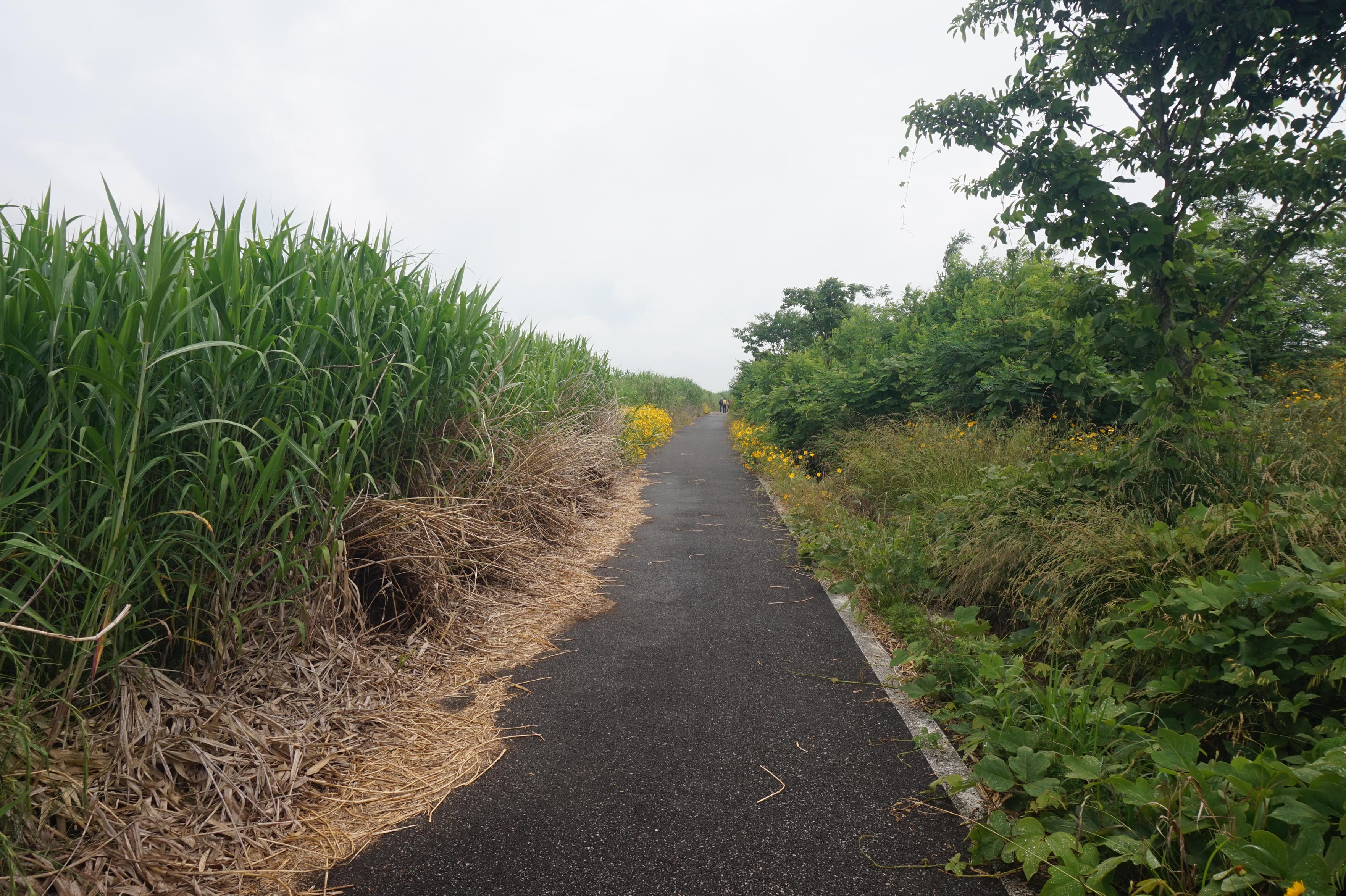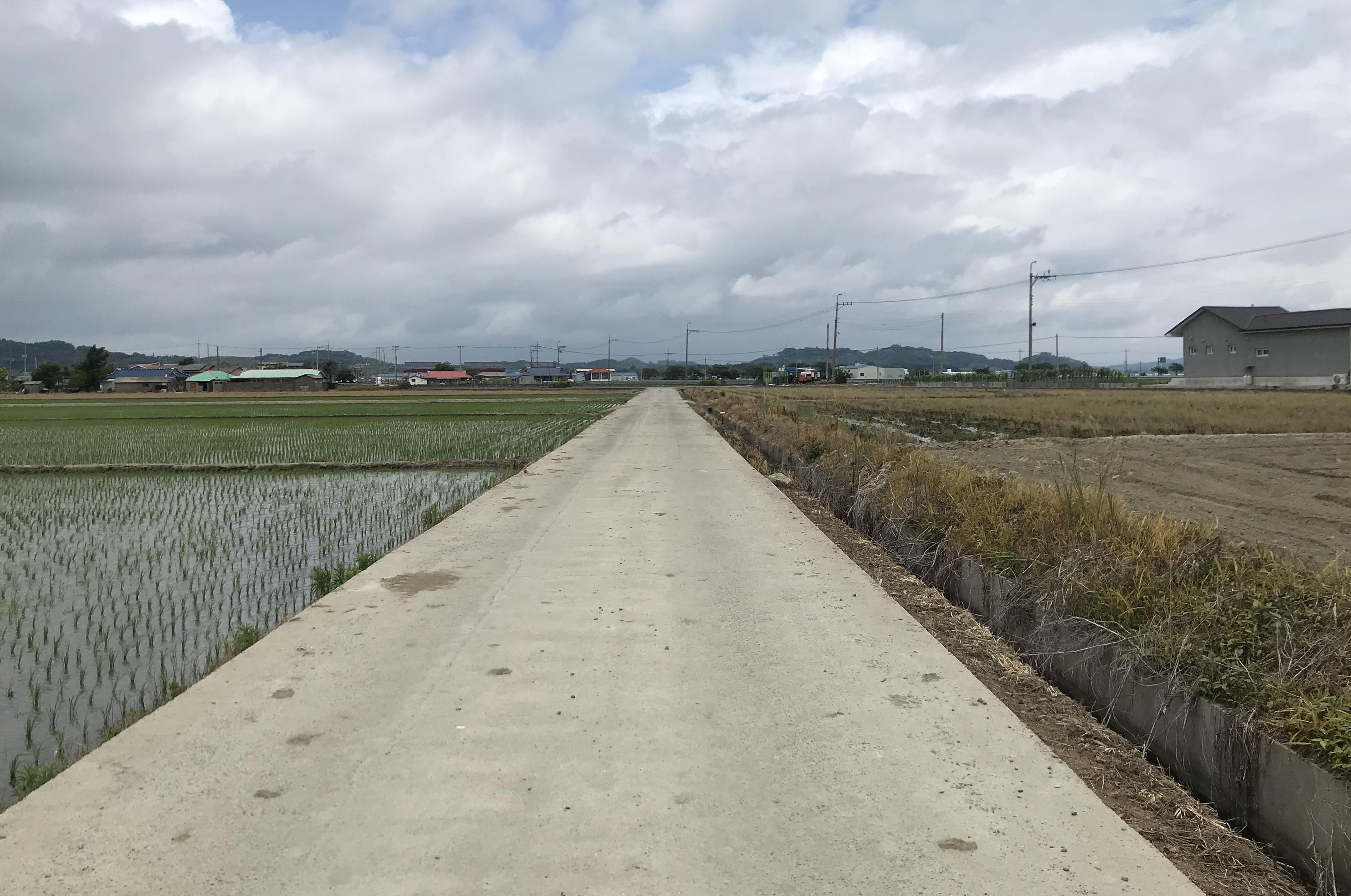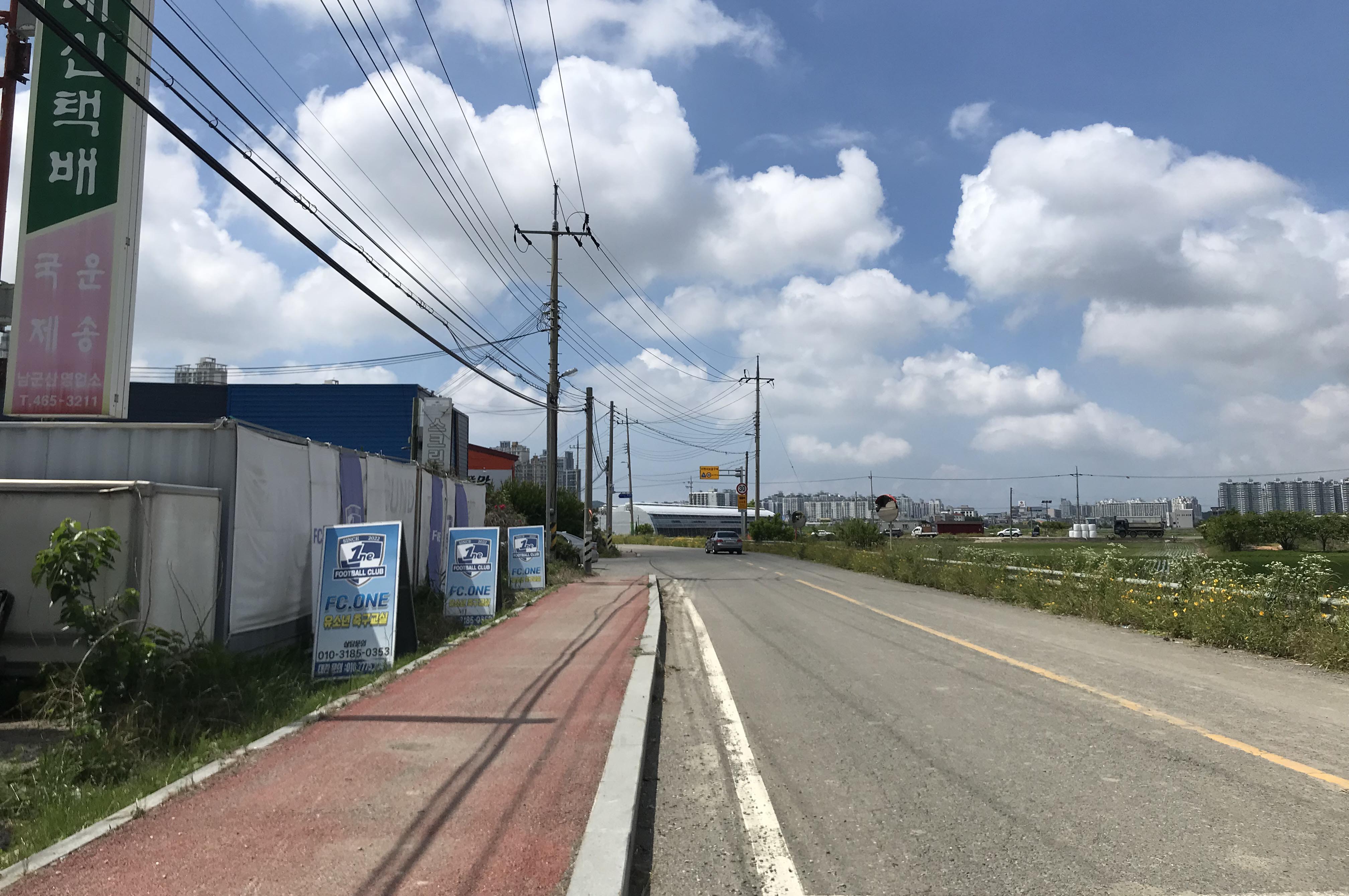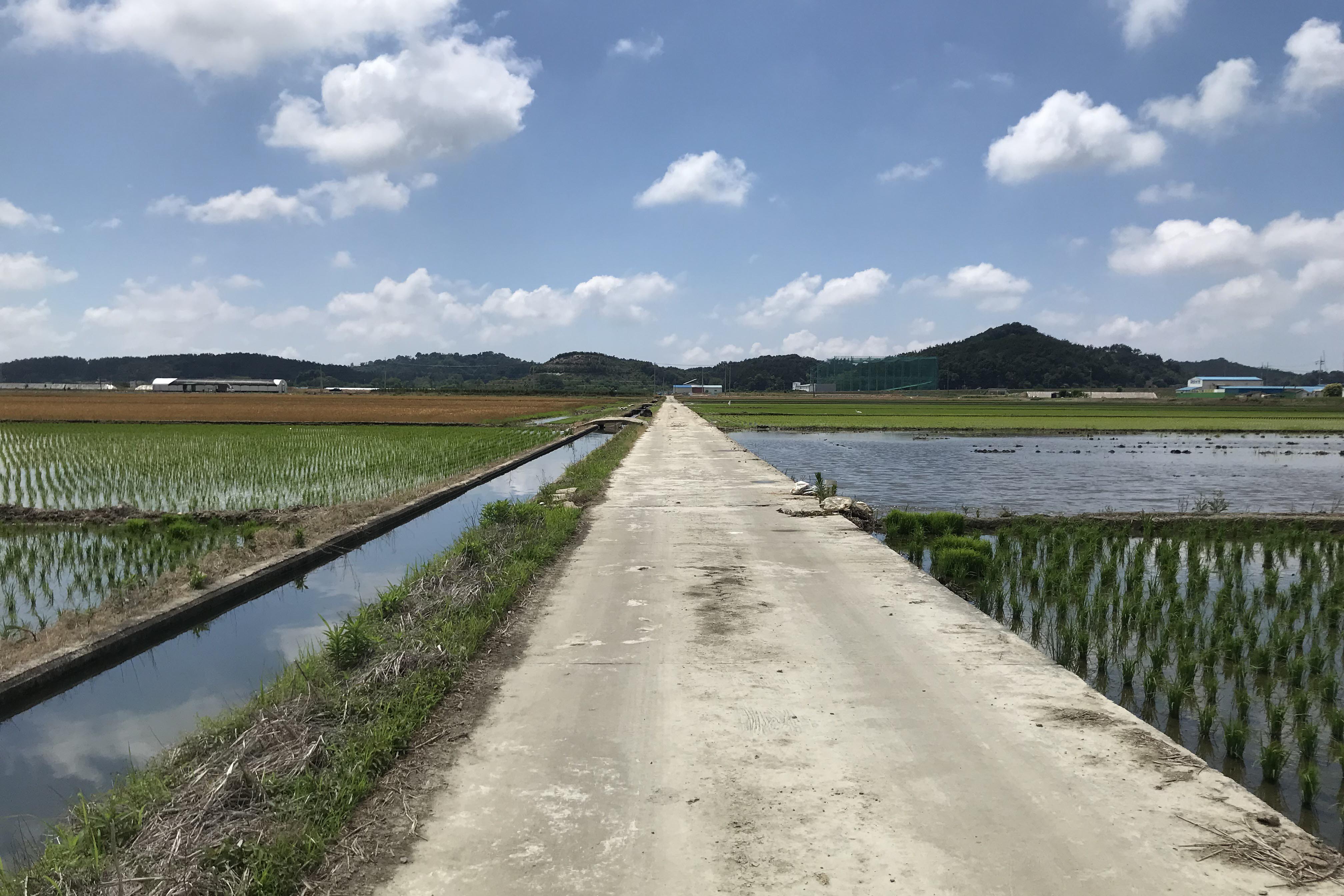 주어진 트레킹 마감시간이 짧은데다, 언제 쏟아질지 모르는 비구름으로 인해 발걸음을 재촉하곤 하였는데, 어느새 파란 하늘에 흰 뭉게구름이 두둥실 떠 있다. 더워진 여름 날씨에 비는 내리지 않아, 더위를 모르고 트레킹 시간을 단축하는 일석이조의 효과를 보았다. 하염없이 석교 들판 농로 따라 방향을 바꿔가며 걷다보니, 앞에 군산시내가 조망되다가 어느새는 야산이 보이는 등 풍경이 자주 바뀐다. 장항선과 연결된 군산항으로 가는 철로 옆에 설치된 펜스 따라 가는데, 화물열차가 정상적으로 운행되는 철로 인지는 확인할 수 없다.