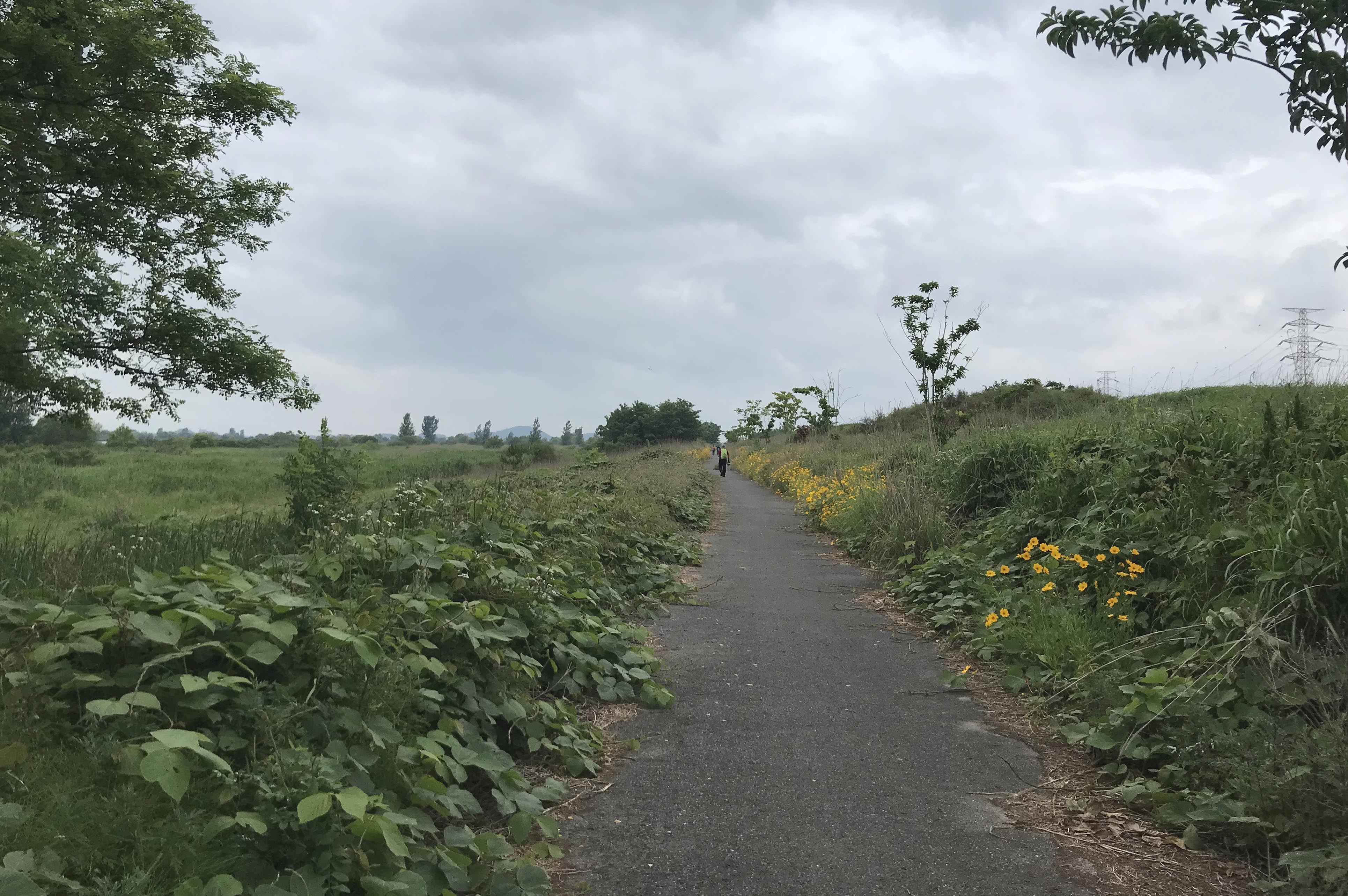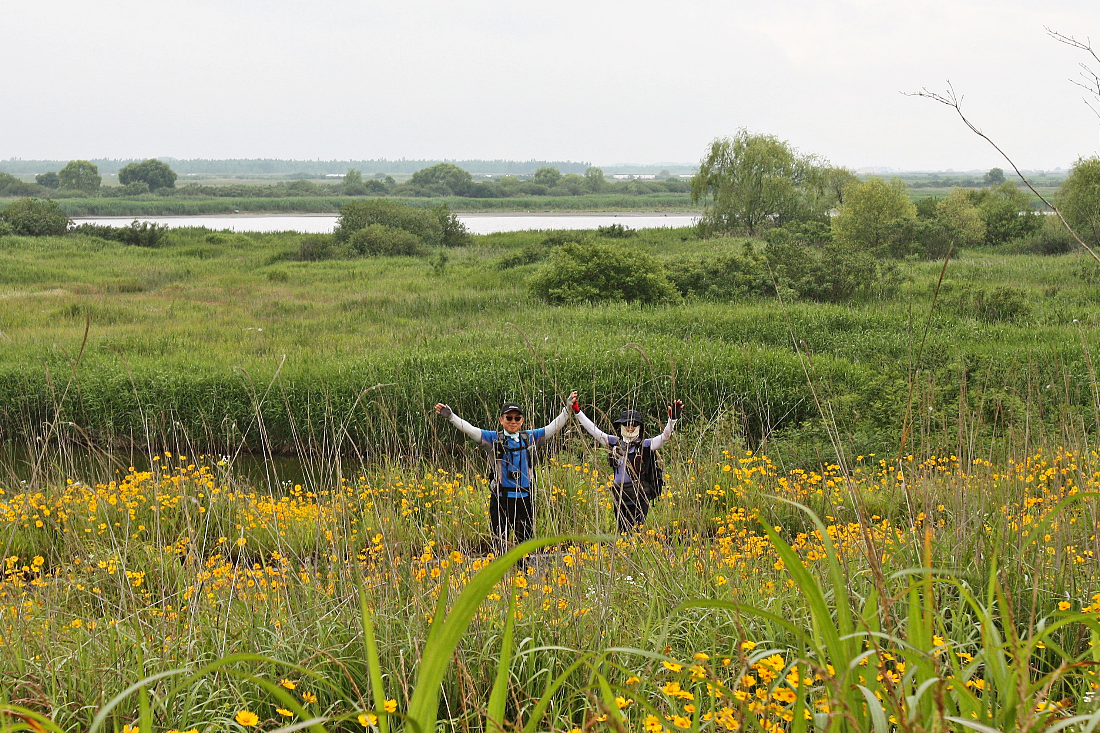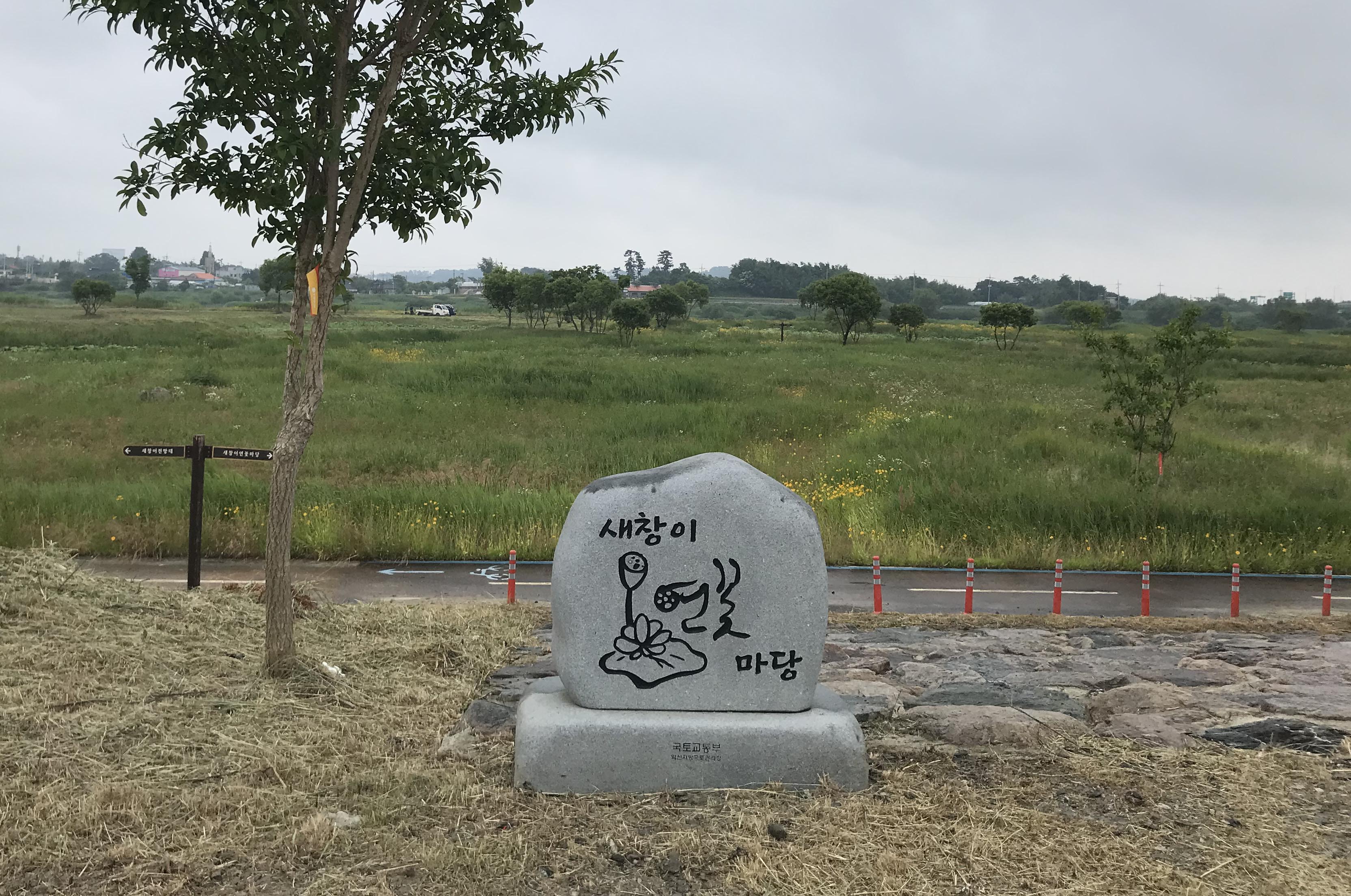 장거리에 난이도도 보통인데 트레킹 시간을 5시간(두루누비 코스안내: 19.4Km, 6시간30분소요)을 주어 15시에 마감하고, 뒤풀이가 끝나는 대로 상경한다. 버스에서 내리자마자 비가 내려 우비를 꺼내 입자, 그치었다 내리기를 반복하더니 멈춘다. 김제 구간이 만경강을 좌측에 두고 왔다하면, 군산 구간부터는 새창이 다리로 유턴하여 와서 다시 만경강은 좌측에 있다. 만경강 기준 우측제방으로 걷는데, 제방아래 둔치에 새창이 연꽃 마당 표시석이 있다. 습지 연못에는 연꽃 개화시기가 안되었는지, 관리가 안 되었는지 풀만 무성하다.