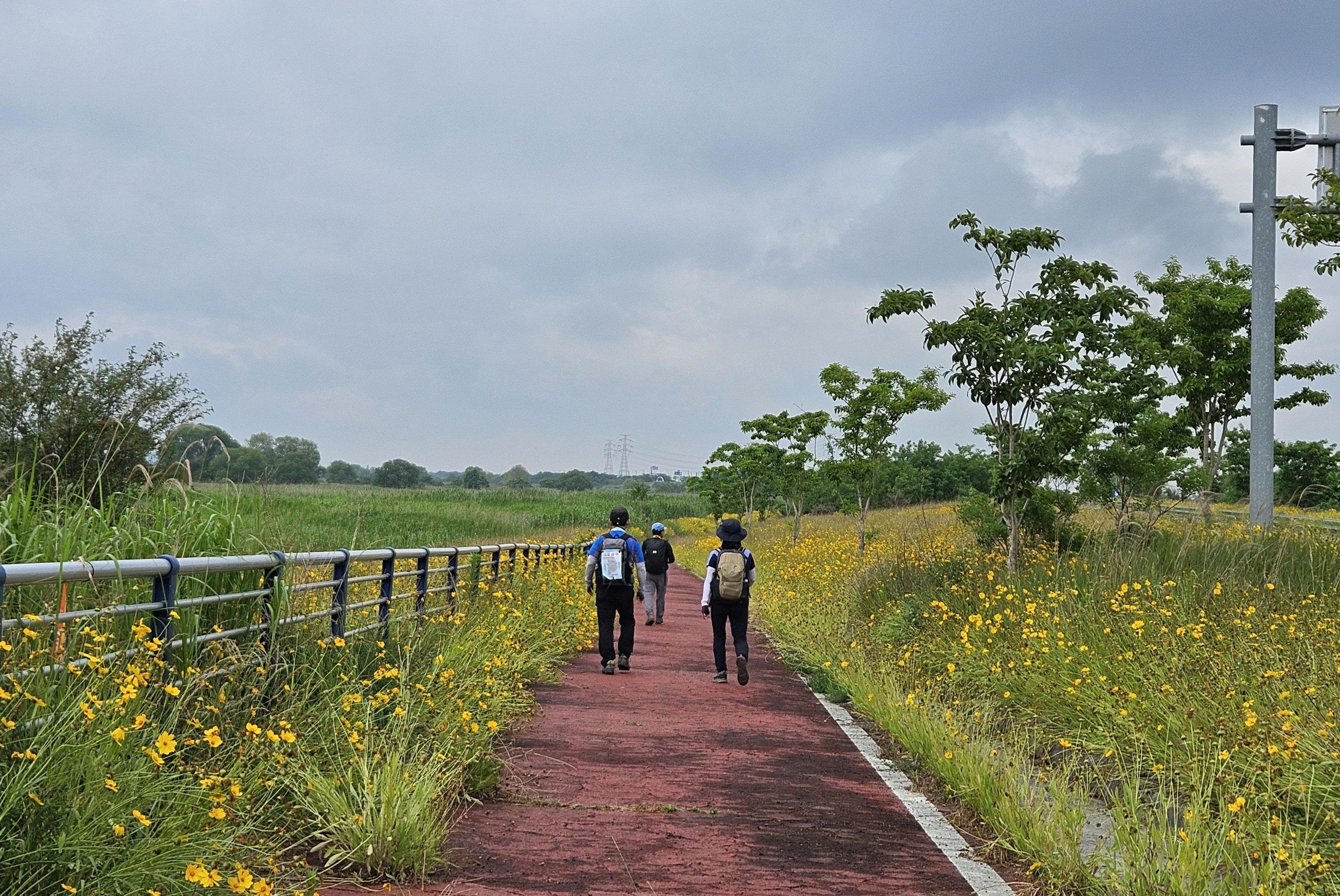 오늘은 오랜만에 왔다고 그러한지 회원님(허총무님, 몽중루님, 수석천님)이 반가워하며 멋진 사진도 많이 찍어준다. 도로 위를 걷고 있는 회원님들은 좌측 만경강과 우측 평야를 동시에 볼 수 있어, 코스가 아니어도 좋다고 올라와서 걸으라고 한다. 두루누비 ②필수경유지를 통과하여도 만경강 둔치 산책로는 계속된다. 학당리(學堂里)에서 금광리(金光里)로 마을이 바뀌면서, 만경강 산책로에서 우측 도로 위로 올라가도록 한다. 금광교 앞의 이정표(새창이다리: 7.1km, 회현면사무소:3.4km)는 방향을 바꿔 만경강과 헤어지게 한다.