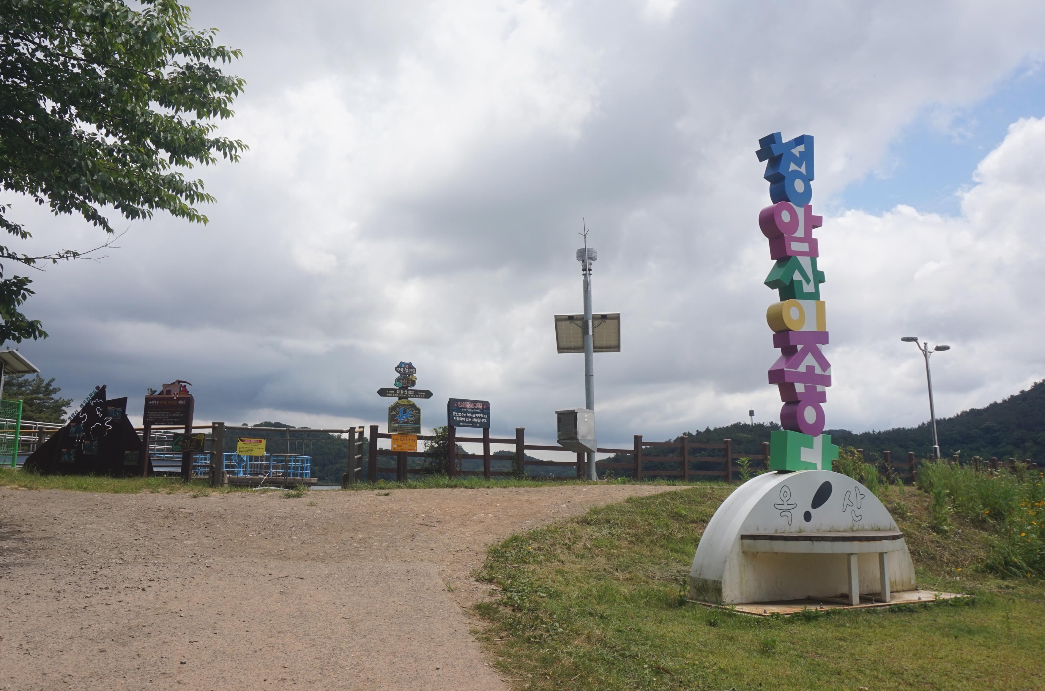 < 13:41,「청암산이 좋다」등 각종 조형물이 제방 인근에 >