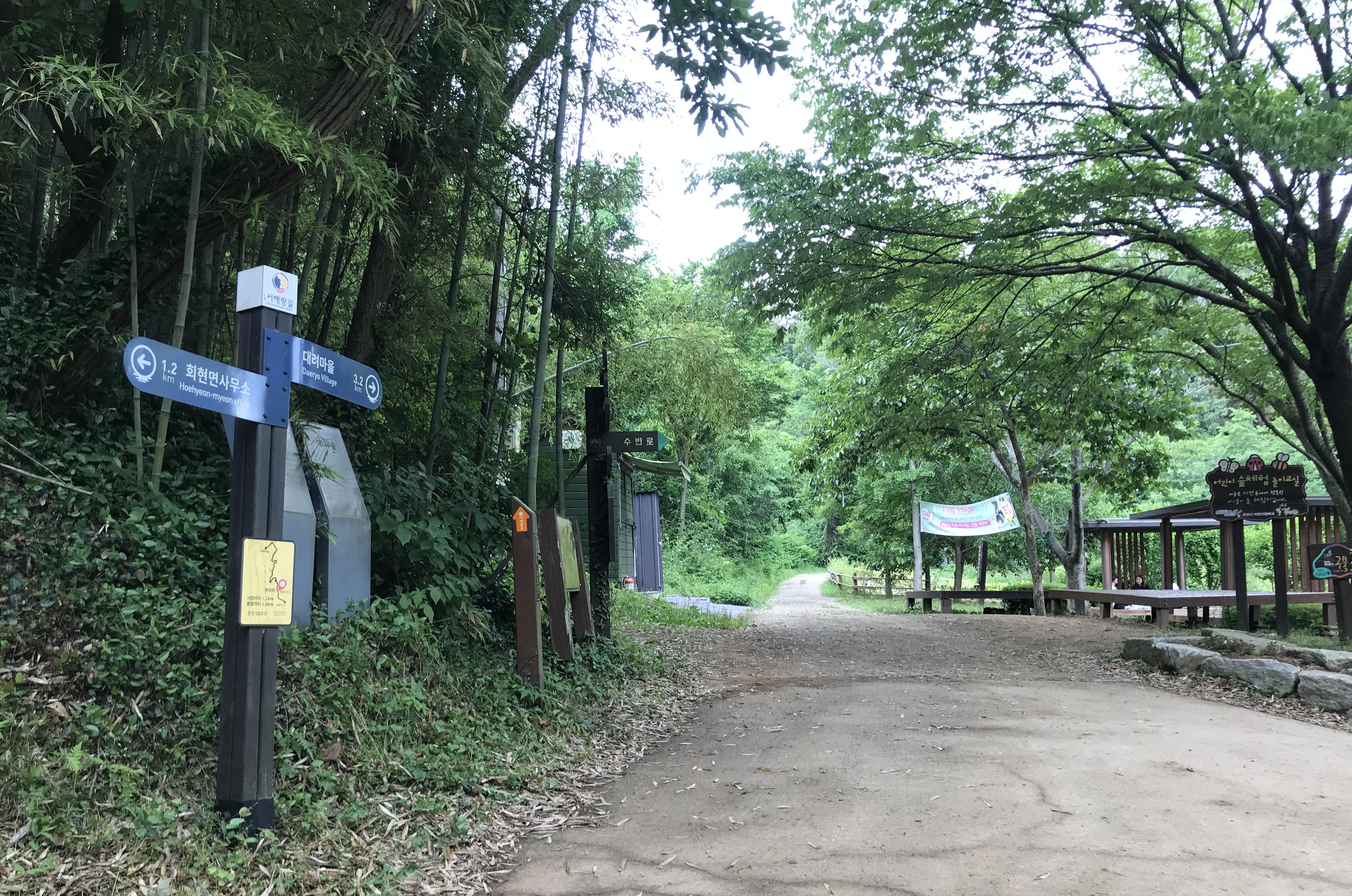 면소재지의 중심 도로인 회현로는 초등학교를 지나자 도로포장 공사를 하느라 어수선하다. 대나무 숲(12:52)으로 진입하자, 회현면 대정리에서 세장리(細長里)로 바뀐다. 대나무 숲을 지나자, 이정표(←회현면사무소: 1.2km, →대려마을:3.2km)와 청암산 에코라운드 안내도가 있는 산책로 입구이다. 에코라운드는 군산 호수와 청암산에 총 18개의 습지군락과 산림군락이 조성되었다. 수변로(13.8km), 청암산 등산로(8km), 구불4길(7.18km) 등 트레킹 코스가 있다. 숲속 구불4길 우측에는 군산호수가 있고, 대나무 숲길이 청량감을 준다.