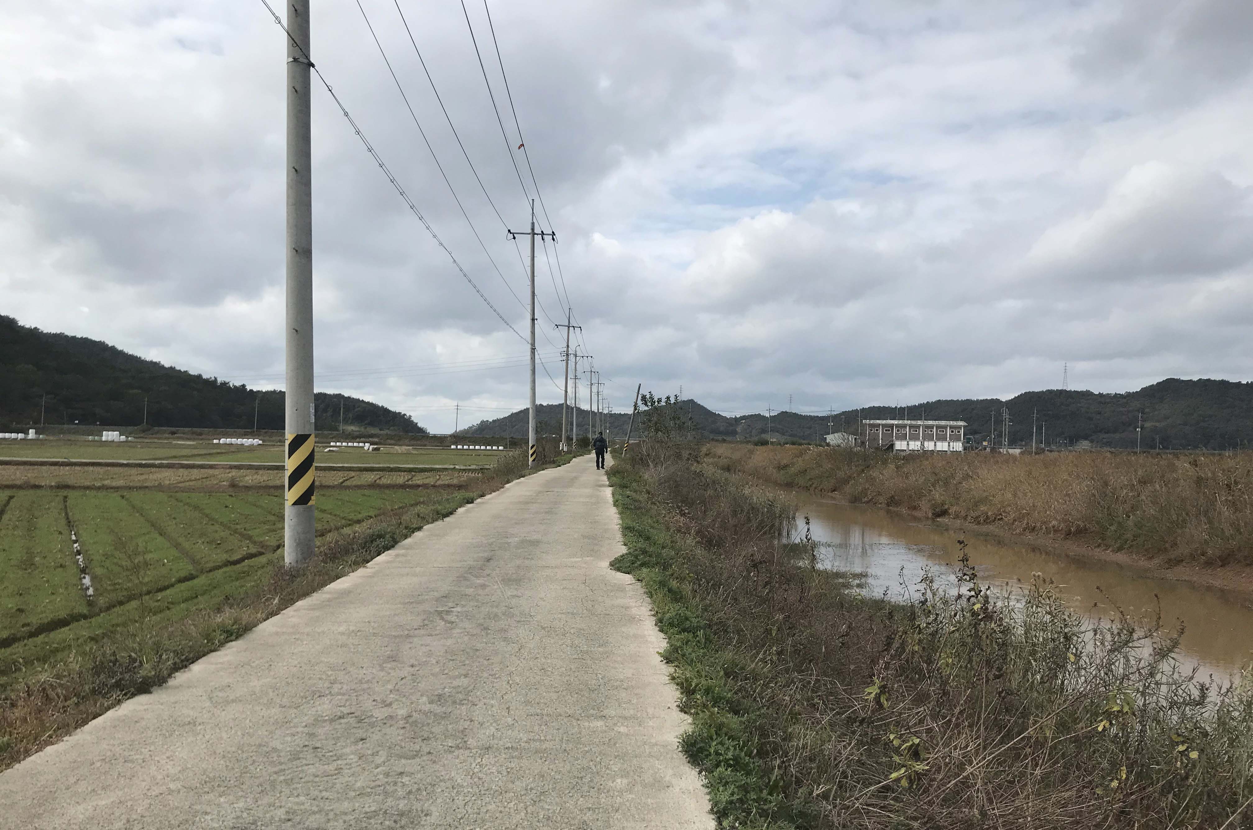 언덕을 내려와 연우로 차도를 건너가니, 법성리에서 진내리(鎭內里)로 동네이름이 바뀐다. 영광굴비 홍보관과 서호농악회 사이 길로 진입하는데, 좌측 뒤로 검산제 저수지가 보인다. 저수지를 옆에 두고 동네 밭길과 마을길을 걸으니, 검산마을 버스 정류장(11:43)이 있는 연우로 차도가 나온다. 검산마을 표시석이 세워진 마을길로 진입하니, 마을 골목 안에 검산 마을 경로당이 있다. 마을에서 좌측으로 보니, 지난주에 걸었던 영광대교가 한눈에 들어온다. 마을을 벗어나면 구암천(九岩川)이 나와 홍농교로 건너는데, 법성면과 홍농읍 경계이다.