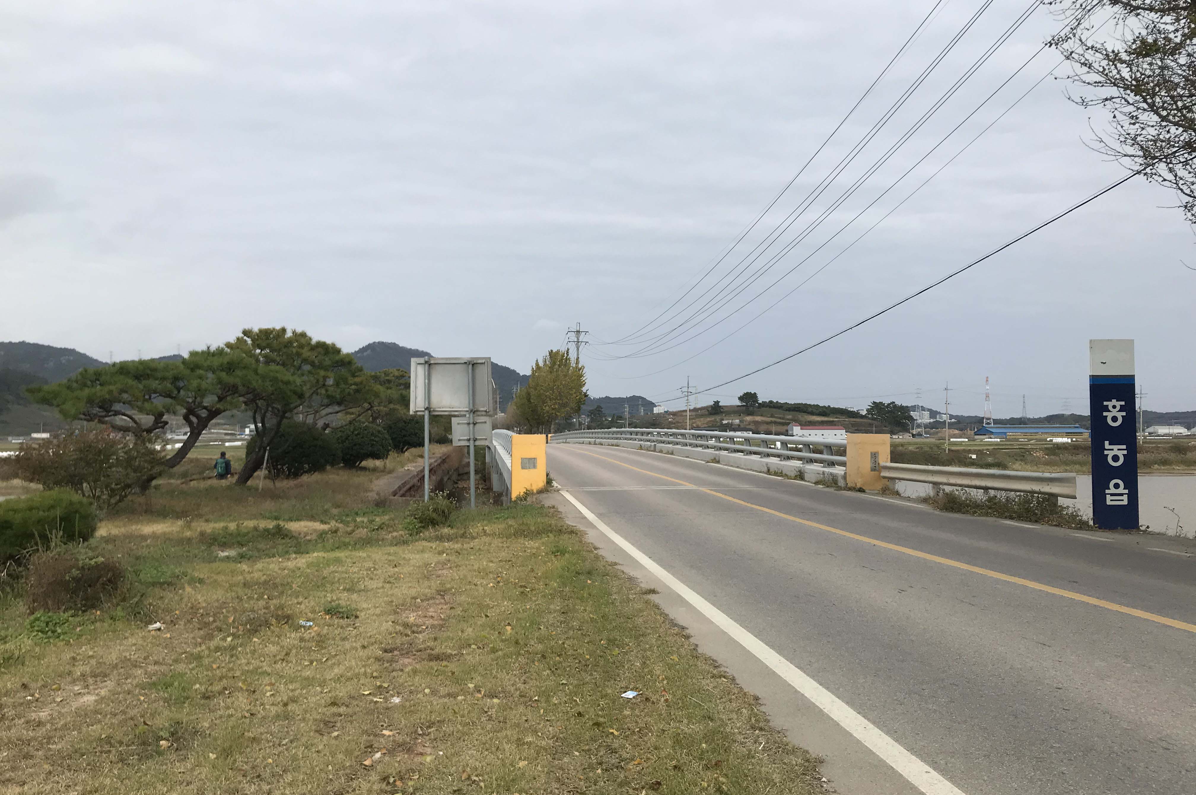 새로 놓인 다리는 차들만 다니고, 구교인 듯한 다리는 인도전용으로 되어 있다. 다리 앞 이정표는 출발하여 2.5km 걸어 왔다고 한다. 홍농읍 읍소재지가 있는 상하리(上下里)를 걷기 시작한다. 신흥마을 입구 지나 차도를 건너, 반대편 월봉마을 입구의 쉼터 정자에서 행동식과 휴식을 25분간 취한다. 중간에 통과하게 되는 두루누비의 앱의 따라가기 필수 경유지 한 곳도 통과하지 못했는데 쉬어간다. 오늘 코스의 길이가 짧아 마감을 일찍 하니, 행동식 시간도 빨라진다. 홍농읍에 들어와서는 논들이 많은 평야와 함께 가끔 마을이 형성되어 있다.