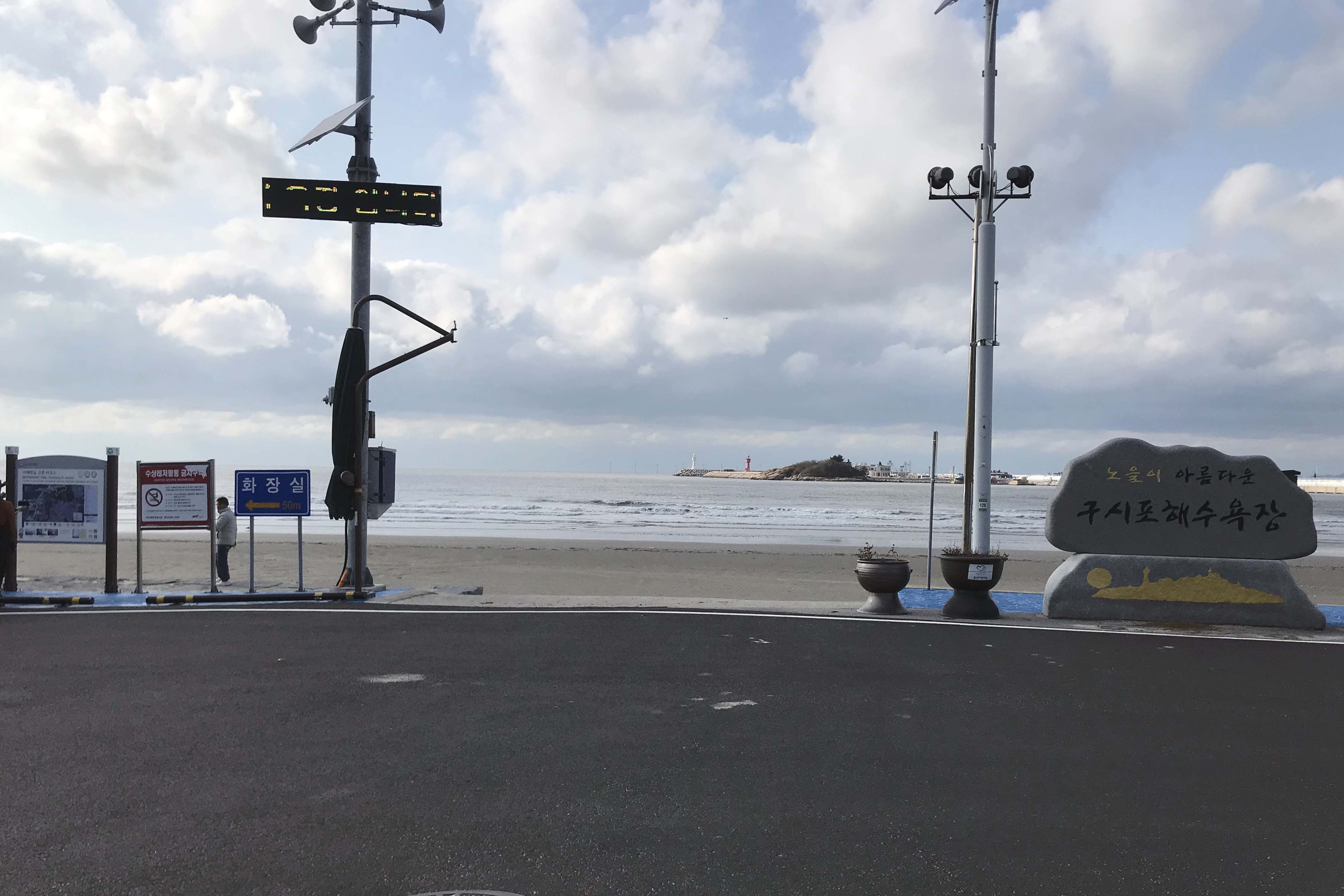 영광의 들판과 마을을 잇는 내륙지역을 통과하다보니 지루한 면도 있었는데, 고갯마루에서 보는 구시포(九市浦) 앞 바다와 길게 이어지는 항남 방파제 및 등대, 그리고 흰 뭉게구름과 파란하늘의 앙상블을 이루는 멋진 풍광에 감탄사를 연발한다. 코스 중에서 제일 아름다운 풍경을 즐기며 내려가니, 구시포 해수욕장과 함께 관광지가 되어 많은 사람들이 찾고 있다. 입구에 있는 울창한 해송 숲으로 이뤄진 구시포 노을 오토캠핑장을 통해 해수욕장 해변으로 나간다. 캠핑장을 지나 해변으로 나가는 길이 있는데 바다를 빨리 보고 싶었던 것 같다.