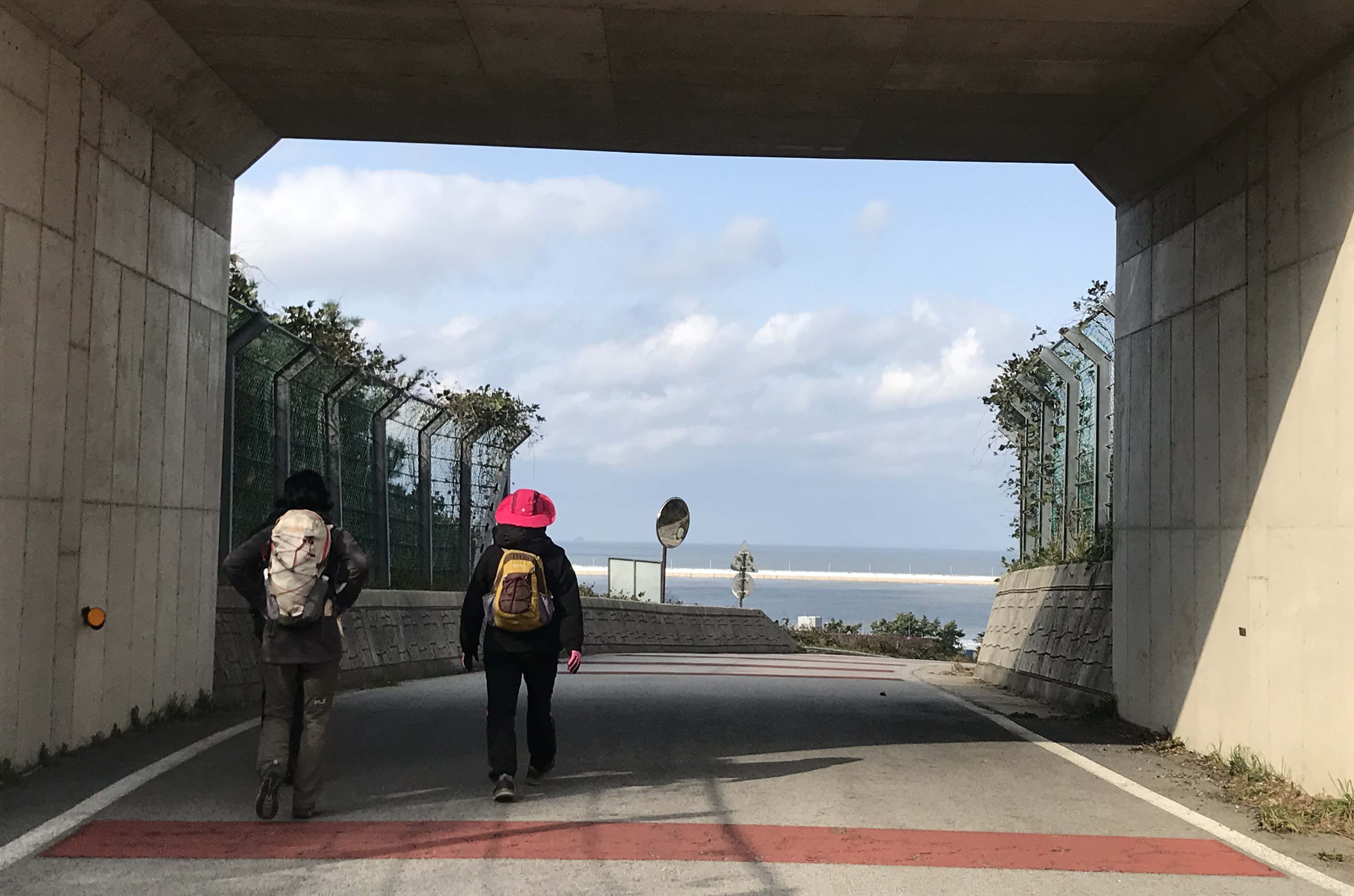 해안가에 위치한 고리포(古里浦) 마을을 앞두고, ⑤번째 마지막 필수경유지를 통과했다고 알려준다. 시점과 종점의 필수경유지를 제외한 중간 필수경유지를 모두 통과한 완주(5개중 3개만 통과해도 완주인정)가 되었다. 20여 가구가 살고 있다는 작은 마을에는 거북선모양을 한 숯불풍천장어 음식점이 있다. 방조제가 끝나는 코너에 있었던 음식점 홍보 사진처럼 1박2일 팀이 식사를 했던 장소 같다. 포구까지 가지 않고 코스는 우측 도로로 오르라 유도한다. 오늘 코스 중에서 제일 높다지만 완만한 고갯길 능선에 주씨고개 표시석을 세워져 있다.