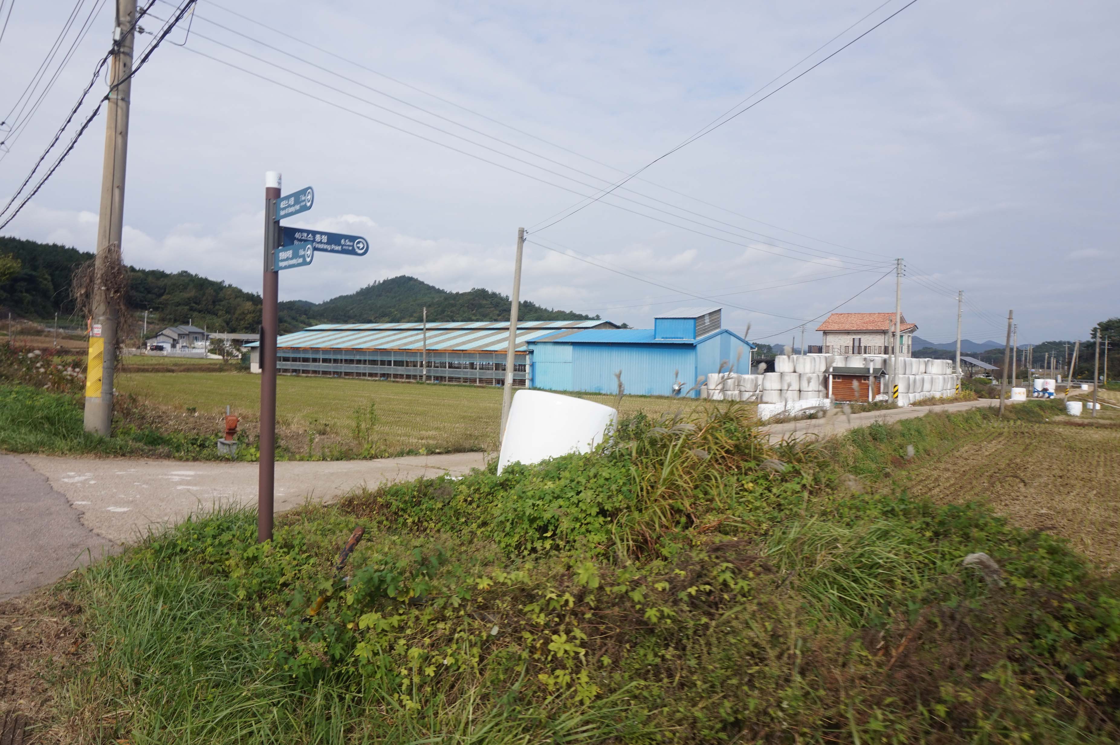 홍농초등학교(12:56)를 지나, 홍농중학교 데크 길에서 ②번 필수경유지 통과 멘트이다. 전체적인 거리가 짧은데 비해 첫 번째가 늦더니, 이젠 자주 통과했음을 알릴 것 같다. 중학교를 떠나면 상하리에서 진덕리(眞德里)로 바뀌면서 입구에서 만났던 홍농로를 다시 만나 좌측으로 이동한다. 차도 우측의 영광승마장과 영광테마식물원 입구(13:04)를 지나고, 고개를 넘으면서 우측에 상삼저수지(13:07)도 보인다. 진덕삼거리 교통안내판은 고창과 구시포가 우측인데, 지나쳐 축사 앞길로 우회시키는데, 럼스킨병으로 통제해 환영받지 못한다.